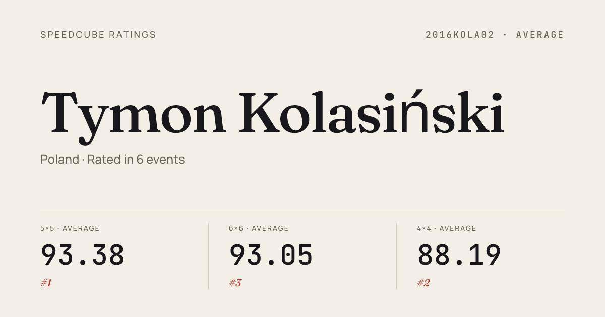 Mar 29, 20263x3x3 Cube · FinalGorzowCubingDays2026 · 1st5.08Mar 29, 20264x4x4 Cube · Round 1GorzowCubingDays2026 · 2nd23.54Mar 29, 20264x4x4 Cube · FinalGorzowCubingDays2026 · 1st20.53Mar 29, 20265x5x5 Cube · Round 1GorzowCubingDays2026 · 1st36.37Mar 29, 20265x5x5 Cube · FinalGorzowCubingDays2026 · 1st36.70Mar 15, 20262x2x2 Cube · Round 1CubeFactoryLeagueRogow2026 · 7th2.21Mar 15, 20262x2x2 Cube · FinalCubeFactoryLeagueRogow2026 · 3rd1.56Mar 15, 20263x3x3 Cube · Round 1CubeFactoryLeagueRogow2026 · 1st5.06Mar 15, 20263x3x3 Cube · FinalCubeFactoryLeagueRogow2026 · 1st4.89Mar 15, 20263x3x3 Cube · Round 2CubeFactoryLeagueRogow2026 · 1st5.29Mar 15, 20264x4x4 Cube · Round 1CubeFactoryLeagueRogow2026 · 1st20.52Mar 15, 20264x4x4 Cube · FinalCubeFactoryLeagueRogow2026 · 1st20.45Mar 8, 20262x2x2 Cube · Round 2GluszycaOpen2026 · 1st1.96Mar 8, 20262x2x2 Cube · Round 1GluszycaOpen2026 · 1st1.50Mar 8, 20262x2x2 Cube · FinalGluszycaOpen2026 · 1st1.41Mar 8, 20263x3x3 Cube · Round 2GluszycaOpen2026 · 1st5.58Mar 8, 20263x3x3 Cube · FinalGluszycaOpen2026 · 1st5.19Mar 8, 20263x3x3 Cube · Round 1GluszycaOpen2026 · 1st4.71Mar 8, 20264x4x4 Cube · FinalGluszycaOpen2026 · 1st20.97