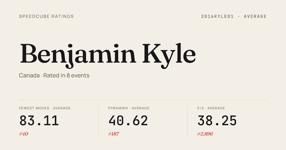 Oct 11, 20253x3x3 Fewest Moves · FinalPleaseBeQuietWaterloo2025 · 3rd25.33Aug 23, 20253x3x3 Fewest Moves · Round 1SlovenianFMCNationals2025 · national · 10th22Aug 23, 20253x3x3 Fewest Moves · FinalSlovenianFMCNationals2025 · national · 1st22.00Aug 9, 20253x3x3 Fewest Moves · FinalFMCaMontreal2025 · 3rd22.67Aug 9, 20253x3x3 Fewest Moves · Round 1FMCaMontreal2025 · 6th22Jul 29, 20253x3x3 Fewest Moves · FinalPSQuebec2025 · 8th24Jul 29, 2025Pyraminx · Combined FinalPSQuebec2025 · 17th1.97Jul 27, 20252x2x2 Cube · Round 2ChampionnatCanadien2025 · national · 20th3.59Jul 27, 20252x2x2 Cube · Round 1ChampionnatCanadien2025 · national · 15th3.20Jul 27, 20253x3x3 Cube · Semi-FinalChampionnatCanadien2025 · national · 24th8.76Jul 27, 20253x3x3 Cube · Round 1ChampionnatCanadien2025 · national · 28th9.36Jul 27, 20253x3x3 Cube · Round 2ChampionnatCanadien2025 · national · 24th9.19Jul 27, 20253x3x3 Blindfolded · Round 2ChampionnatCanadien2025 · national · 24th2:25.14Jul 27, 20253x3x3 Blindfolded · Round 1ChampionnatCanadien2025 · national · 37th4:36.01Jul 27, 20253x3x3 One-Handed · Round 2ChampionnatCanadien2025 · national · 27th17.11Jul 27, 20253x3x3 One-Handed · Round 1ChampionnatCanadien2025 · national · 41st20.72Jul 27, 2025Pyraminx · Round 2ChampionnatCanadien2025 · national · 4th2.39Jul 27, 2025Pyraminx · Round 1ChampionnatCanadien2025 · national · 2nd2.77Jul 27, 2025Pyraminx · FinalChampionnatCanadien2025 · national · 5th2.79Apr 26, 20253x3x3 Fewest Moves · FinalFMCCanada2025 · national · 33rd25