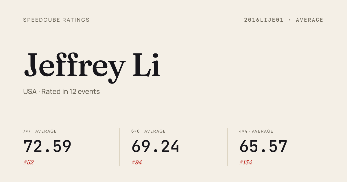 Mar 21, 20264x4x4 Cube · FinalCubeAgainstCancerBoston2026 · 2nd27.03Mar 21, 20265x5x5 Cube · FinalCubeAgainstCancerBoston2026 · 4th58.61Mar 21, 20265x5x5 Cube · Round 1CubeAgainstCancerBoston2026 · 4th54.15Mar 21, 20267x7x7 Cube · FinalCubeAgainstCancerBoston2026 · 2nd2:17.96Mar 21, 2026Megaminx · Combined FinalCubeAgainstCancerBoston2026 · 3rd48.53Mar 21, 2026Square-1 · Combined FinalCubeAgainstCancerBoston2026 · 4th10.78Nov 2, 20257x7x7 Cube · FinalCubingUSAAllStars2025 · national · 4th2:09.08Aug 9, 20252x2x2 Cube · FinalAshfieldSummerNxN2025 · 4th2.50Aug 9, 20252x2x2 Cube · Round 1AshfieldSummerNxN2025 · 2nd1.89Aug 9, 20253x3x3 Cube · FinalAshfieldSummerNxN2025 · 4th8.81Aug 9, 20253x3x3 Cube · Round 1AshfieldSummerNxN2025 · 4th8.19Aug 9, 20255x5x5 Cube · FinalAshfieldSummerNxN2025 · 1st50.70Aug 9, 20256x6x6 Cube · FinalAshfieldSummerNxN2025 · 1st1:24.09Aug 9, 20257x7x7 Cube · FinalAshfieldSummerNxN2025 · 1st1:57.26Aug 9, 2025Square-1 · FinalAshfieldSummerNxN2025 · 3rd10.47Aug 9, 2025Square-1 · Round 1AshfieldSummerNxN2025 · 2nd9.87Aug 3, 20252x2x2 Cube · Round 2NewEnglandChampionship2025 · 23rd2.64Aug 3, 20252x2x2 Cube · Round 1NewEnglandChampionship2025 · 20th2.72Aug 3, 20253x3x3 Cube · Round 2NewEnglandChampionship2025 · 23rd9.41Aug 3, 20253x3x3 Cube · Semi-FinalNewEnglandChampionship2025 · 45th11.07