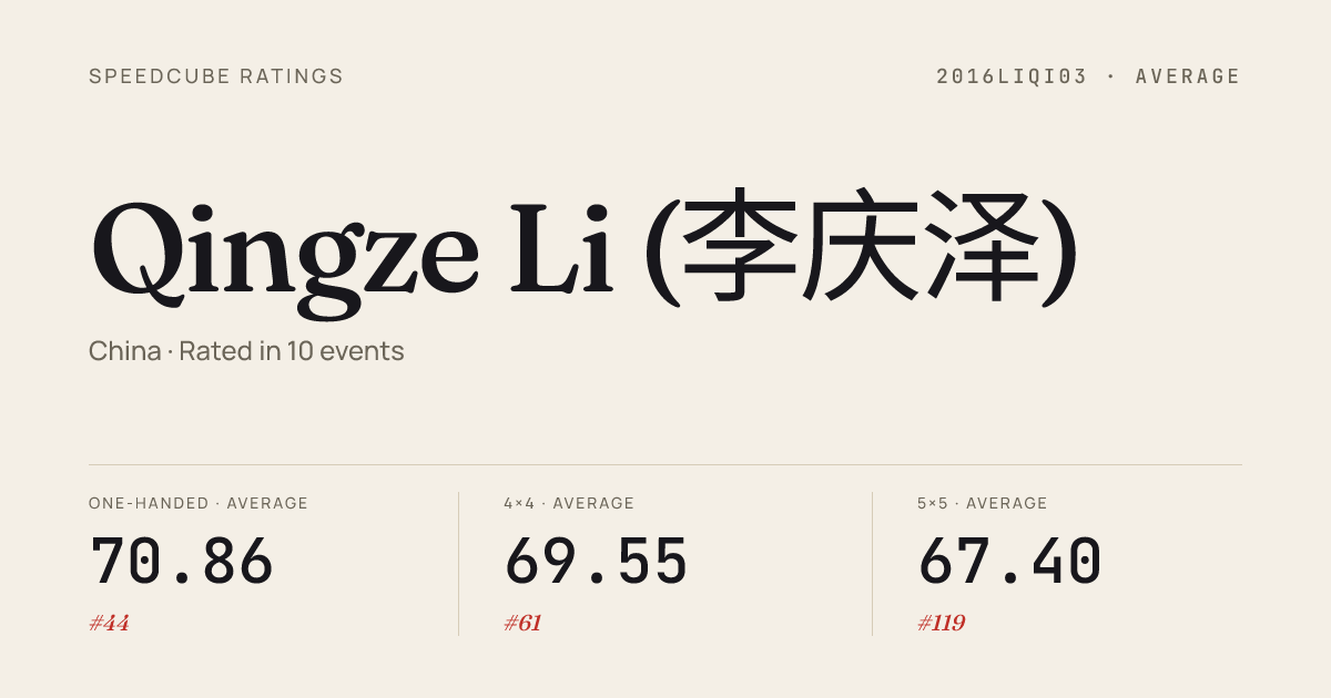 Mar 7, 20263x3x3 Cube · Round 2XianjuNxN2026 · 12th6.88Mar 7, 20263x3x3 Cube · Semi-FinalXianjuNxN2026 · 20th7.47Mar 7, 20263x3x3 One-Handed · Round 1XianjuNxN2026 · 3rd10.72Mar 7, 20263x3x3 One-Handed · FinalXianjuNxN2026 · 4th11.34Mar 7, 20264x4x4 Cube · FinalXianjuNxN2026 · 2nd24.38Mar 7, 20264x4x4 Cube · Round 1XianjuNxN2026 · 1st24.68Mar 7, 20265x5x5 Cube · Round 1XianjuNxN2026 · 4th53.39Mar 7, 20265x5x5 Cube · FinalXianjuNxN2026 · 1st47.31Mar 1, 20264x4x4 Cube · FinalQuanzhouBigCubes2026 · 6th27.36Mar 1, 20264x4x4 Cube · Round 1QuanzhouBigCubes2026 · 4th27.19Mar 1, 20265x5x5 Cube · Round 1QuanzhouBigCubes2026 · 7th51.68Mar 1, 20265x5x5 Cube · FinalQuanzhouBigCubes2026 · 9th51.66Mar 1, 20266x6x6 Cube · Round 1QuanzhouBigCubes2026 · 5th1:31.00Mar 1, 20266x6x6 Cube · FinalQuanzhouBigCubes2026 · 6th1:35.88Mar 1, 20267x7x7 Cube · Round 1QuanzhouBigCubes2026 · 12th2:39.67Mar 1, 20267x7x7 Cube · FinalQuanzhouBigCubes2026 · 16th2:35.97Jan 11, 20263x3x3 Cube · Semi-FinalBeijingWinter2026 · 22nd7.77Jan 11, 20263x3x3 Cube · Round 1BeijingWinter2026 · 19th7.51Jan 11, 20263x3x3 Cube · Round 2BeijingWinter2026 · 20th7.84