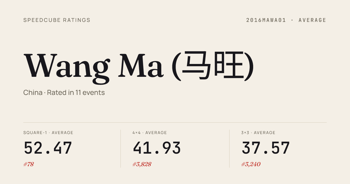 Feb 28, 2026Square-1 · Combined FinalUMassSpring2026 · 2nd9.03Jan 17, 20263x3x3 Cube · Round 1OhioStateWinter2026 · 17th10.29Jan 17, 20263x3x3 Cube · Round 2OhioStateWinter2026 · 17th10.05Jan 17, 20265x5x5 Cube · Combined FinalOhioStateWinter2026 · 28th1:36.68Jan 17, 2026Square-1 · FinalOhioStateWinter2026 · 2nd8.49Jan 17, 2026Square-1 · Round 1OhioStateWinter2026 · 4th9.62Jan 1, 20262x2x2 Cube · FinalNewYorkNewYear2025 · 14th2.72Jan 1, 20262x2x2 Cube · Round 1NewYorkNewYear2025 · 16th3.22Jan 1, 20263x3x3 Cube · FinalNewYorkNewYear2025 · 11th10.01Jan 1, 20263x3x3 Cube · Round 1NewYorkNewYear2025 · 12th9.38Jan 1, 20265x5x5 Cube · Combined FinalNewYorkNewYear2025 · 21st1:32.67Jan 1, 20266x6x6 Cube · Round 1NewYorkNewYear2025 · 25th4:18.94Jan 1, 2026Pyraminx · Round 1NewYorkNewYear2025 · 27th8.13Jan 1, 2026Square-1 · Combined FinalNewYorkNewYear2025 · 2nd8.59Nov 2, 20253x3x3 Cube · Round 2PennCubeDayFall2025 · 13th9.71Nov 2, 20253x3x3 Cube · FinalPennCubeDayFall2025 · 9th9.93Nov 2, 20253x3x3 Cube · Round 1PennCubeDayFall2025 · 10th9.79Nov 2, 2025Clock · Combined FinalPennCubeDayFall2025 · 25th14.19Nov 2, 2025Megaminx · Combined FinalPennCubeDayFall2025 · 30th2:25.87