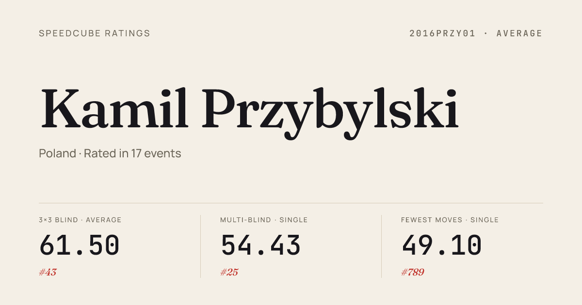 Mar 29, 20263x3x3 Blindfolded · Round 1GorzowCubingDays2026 · 2nd22.60Mar 29, 20263x3x3 Blindfolded · FinalGorzowCubingDays2026 · 2nd22.75Mar 29, 20263x3x3 One-Handed · Round 1GorzowCubingDays2026 · 42nd54.65Mar 29, 20264x4x4 Cube · Round 1GorzowCubingDays2026 · 40th1:05.63Mar 29, 20265x5x5 Cube · Round 1GorzowCubingDays2026 · 35th2:24.69Mar 29, 2026Clock · Round 1GorzowCubingDays2026 · 24th12.76Mar 29, 2026Pyraminx · Round 1GorzowCubingDays2026 · 46th14.35Mar 29, 2026Skewb · Round 1GorzowCubingDays2026 · 47th17.45Mar 29, 2026Square-1 · Round 1GorzowCubingDays2026 · 10th17.27Mar 29, 2026Square-1 · FinalGorzowCubingDays2026 · 12th24.08Mar 8, 20263x3x3 Blindfolded · Round 2BrizZonSideOpenII2026 · 5th24.36Mar 8, 20263x3x3 Blindfolded · Round 1BrizZonSideOpenII2026 · 2nd19.06Mar 8, 20263x3x3 Blindfolded · FinalBrizZonSideOpenII2026 · 1st16.80Mar 8, 20263x3x3 Multi-Blind · FinalBrizZonSideOpenII2026 · 5th32/47 in 59:18Mar 8, 2026Clock · Round 1BrizZonSideOpenII2026 · 21st12.63Mar 8, 2026Megaminx · Round 1BrizZonSideOpenII2026 · 26th2:37.89Mar 8, 2026Square-1 · Round 1BrizZonSideOpenII2026 · 11th21.38Mar 8, 2026Square-1 · Round 2BrizZonSideOpenII2026 · 11th24.30Feb 15, 20263x3x3 Multi-Blind · Round 1MultiBlindiJonkoping2026 · 3rd20/21 in 28:02