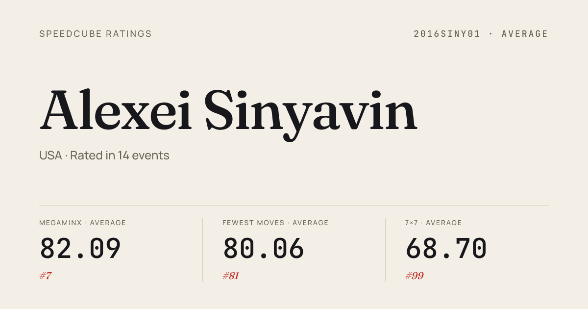 Apr 11, 20266x6x6 Cube · Combined FinalMarbleCityCubingNY2026 · 1st1:33.54Apr 11, 20267x7x7 Cube · Combined FinalMarbleCityCubingNY2026 · 1st2:18.51Apr 11, 2026Clock · Round 1MarbleCityCubingNY2026 · 10th11.76Apr 11, 2026Megaminx · Round 1MarbleCityCubingNY2026 · 1st29.77Apr 11, 2026Megaminx · FinalMarbleCityCubingNY2026 · 1st29.53Apr 11, 2026Square-1 · Round 1MarbleCityCubingNY2026 · 4th12.64Apr 11, 2026Square-1 · FinalMarbleCityCubingNY2026 · 4th12.64Apr 5, 20263x3x3 One-Handed · Round 1SideEventsinPalisades2026 · 14th15.63Apr 5, 20263x3x3 One-Handed · Round 2SideEventsinPalisades2026 · 14th15.58Apr 5, 20265x5x5 Cube · FinalSideEventsinPalisades2026 · 2nd51.82Apr 5, 20265x5x5 Cube · Round 1SideEventsinPalisades2026 · 6th54.55Apr 5, 20266x6x6 Cube · FinalSideEventsinPalisades2026 · 2nd1:35.43Apr 5, 20267x7x7 Cube · FinalSideEventsinPalisades2026 · 1st2:17.09Apr 5, 2026Megaminx · Round 2SideEventsinPalisades2026 · 1st28.45Apr 5, 2026Megaminx · Round 1SideEventsinPalisades2026 · 1st29.69Apr 5, 2026Megaminx · FinalSideEventsinPalisades2026 · 1st28.81Apr 5, 2026Square-1 · FinalSideEventsinPalisades2026 · 10th14.01Apr 5, 2026Square-1 · Round 1SideEventsinPalisades2026 · 7th11.44Apr 5, 2026Square-1 · Round 2SideEventsinPalisades2026 · 8th11.50
