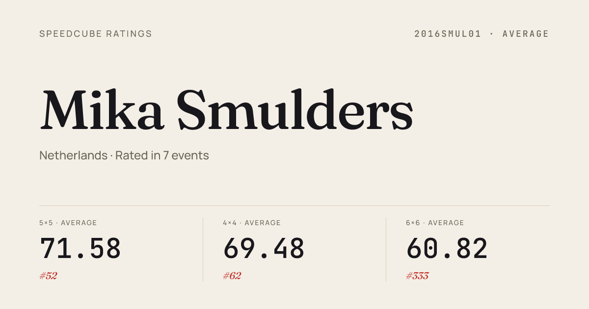 - Mar 8, 20263x3x3 Cube · Round 1ClassicCubingCapelle2026 · 2nd6.95