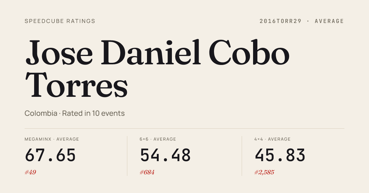 Feb 21, 2026Megaminx · Round 2PocosCuposBogotaXXII2026 · 1st37.74Feb 21, 2026Megaminx · FinalPocosCuposBogotaXXII2026 · 1st35.47Feb 21, 2026Square-1 · Round 1PocosCuposBogotaXXII2026 · 8th29.33Feb 21, 2026Square-1 · Round 2PocosCuposBogotaXXII2026 · 10th34.92Jan 7, 20266x6x6 Cube · Round 1PocosCuposBogotaXVIII2026 · 3rd2:02.80Jan 7, 20266x6x6 Cube · FinalPocosCuposBogotaXVIII2026 · 1st1:56.87Jan 7, 20267x7x7 Cube · FinalPocosCuposBogotaXVIII2026 · 5th3:34.67Jan 7, 20267x7x7 Cube · Round 1PocosCuposBogotaXVIII2026 · 6th3:30.34Jan 7, 2026Megaminx · FinalPocosCuposBogotaXVIII2026 · 1st35.11Jan 7, 2026Megaminx · Round 1PocosCuposBogotaXVIII2026 · 1st36.18Jan 7, 2026Square-1 · FinalPocosCuposBogotaXVIII2026 · 9th32.15Jan 7, 2026Square-1 · Round 1PocosCuposBogotaXVIII2026 · 9th28.08Nov 11, 20242x2x2 Cube · Round 1ColombianNationals2024 · national · 41st4.22Nov 11, 20242x2x2 Cube · Round 2ColombianNationals2024 · national · 21st3.68Nov 11, 20243x3x3 Cube · Round 2ColombianNationals2024 · national · 6th9.11Nov 11, 20243x3x3 Cube · Semi-FinalColombianNationals2024 · national · 9th9.50Nov 11, 20243x3x3 Cube · FinalColombianNationals2024 · national · 7th9.53Nov 11, 20243x3x3 Cube · Round 1ColombianNationals2024 · national · 9th8.99Nov 11, 20243x3x3 One-Handed · Round 1ColombianNationals2024 · national · 36th22.50Nov 11, 20244x4x4 Cube · FinalColombianNationals2024 · national · 6th33.86