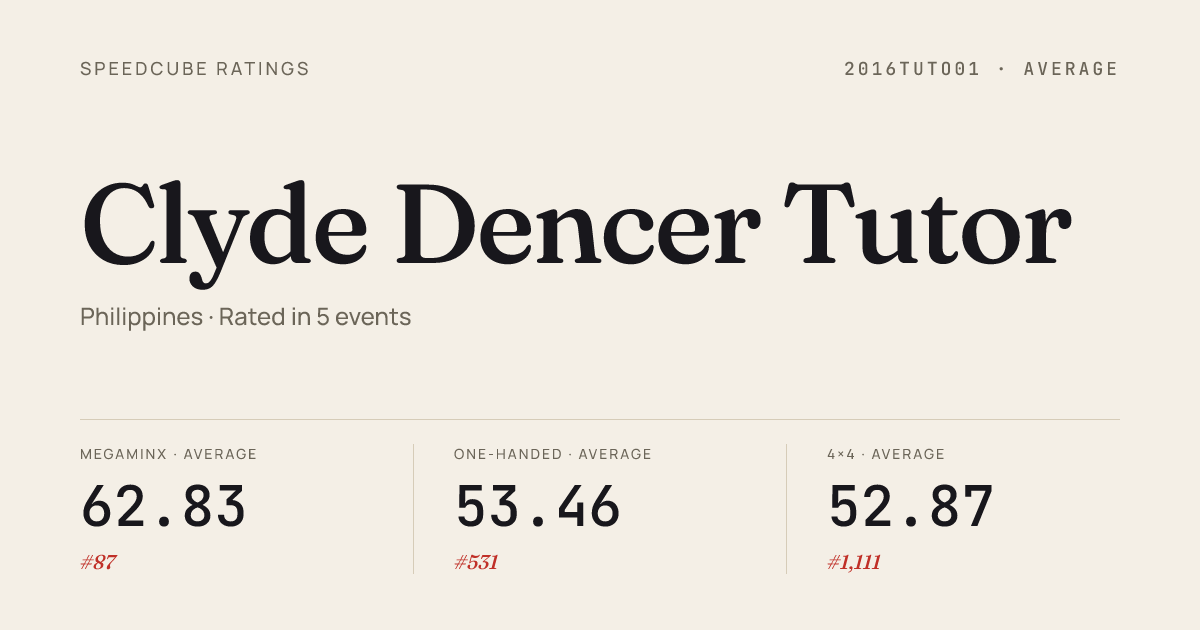 - Mar 22, 20263x3x3 Cube · FinalDavaoCityOpen2026 · 5th9.42