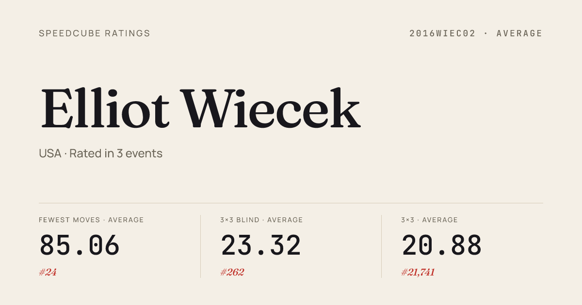 Nov 2, 20253x3x3 Fewest Moves · FinalCubingUSAAllStars2025 · national · 6th23.33Jul 19, 20253x3x3 Fewest Moves · FinalNewEnglandQuietChamps2025 · 14th23Jan 26, 20253x3x3 Blindfolded · FinalAmherstWinterChallenge2025 · 6th1:12.11Jan 26, 20253x3x3 Blindfolded · Round 1AmherstWinterChallenge2025 · 3rd53.98Jan 26, 20253x3x3 Fewest Moves · FinalAmherstWinterChallenge2025 · 1st21.67Jan 26, 20253x3x3 Fewest Moves · Round 1AmherstWinterChallenge2025 · 2nd23.67Dec 7, 20243x3x3 Fewest Moves · FinalWorcesterWinterChallenge2024 · 4th27.33Dec 7, 20243x3x3 Fewest Moves · Round 1WorcesterWinterChallenge2024 · 5th25.00Sep 29, 20243x3x3 Fewest Moves · FinalSideEventsinNyack2024 · 4th26.67Aug 19, 20243x3x3 Cube · FinalLexingtonWeeknightsVI2024 · 14th14.35Aug 19, 20243x3x3 Blindfolded · FinalLexingtonWeeknightsVI2024 · 2nd47.98Aug 19, 20243x3x3 Blindfolded · Round 1LexingtonWeeknightsVI2024 · 1st47.95Aug 19, 20243x3x3 One-Handed · Round 1LexingtonWeeknightsVI2024 · 12th32.27Aug 19, 20243x3x3 One-Handed · Combined FinalLexingtonWeeknightsVI2024 · 11th31.46Aug 10, 20243x3x3 Fewest Moves · FinalNewEnglandQuietChampionship2024 · 4th27.67Aug 10, 20243x3x3 Multi-Blind · FinalNewEnglandQuietChampionship2024 · 9th2/2 in 1:58Aug 10, 20244x4x4 Blindfolded · FinalNewEnglandQuietChampionship2024 · 2nd6:29.35Mar 16, 20243x3x3 Blindfolded · FinalAmherstSpringChallenge2024 · 5th1:01.74Mar 16, 20243x3x3 Blindfolded · Round 1AmherstSpringChallenge2024 · 3rd37.68Mar 2, 20243x3x3 Cube · Round 1TheBattleofConcord2024 · 28th14.51