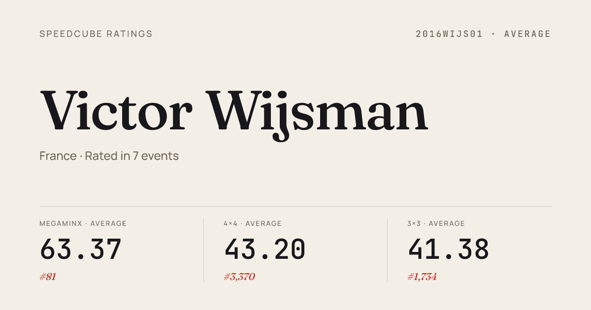 - Apr 6, 20263x3x3 Cube · Round 1FrenchChampionship2026 · national · 37th9.05