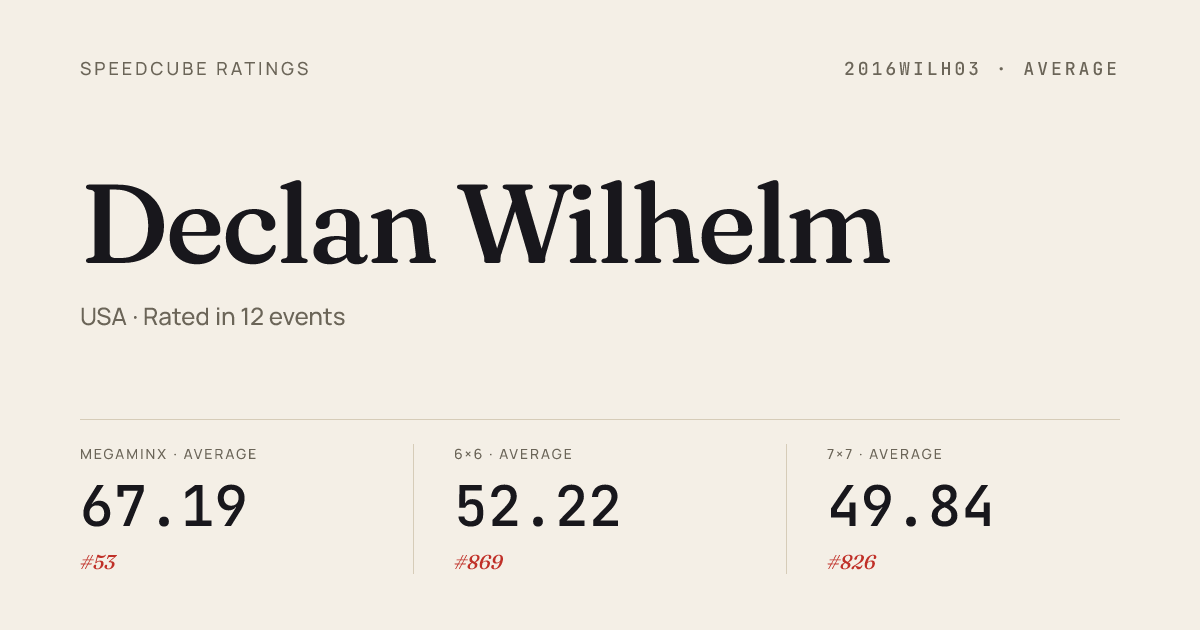 Apr 19, 20264x4x4 Cube · Round 1HappyValleySpringPA2026 · 8th41.35Apr 19, 20264x4x4 Cube · FinalHappyValleySpringPA2026 · 5th35.91Apr 19, 20265x5x5 Cube · Combined FinalHappyValleySpringPA2026 · 5th1:07.61Apr 11, 20263x3x3 Cube · FinalEphrataSpring2026 · 2nd8.96Apr 11, 20263x3x3 Cube · Round 1EphrataSpring2026 · 4th8.86Apr 11, 20263x3x3 Cube · Round 2EphrataSpring2026 · 8th10.22Apr 11, 20264x4x4 Cube · Combined FinalEphrataSpring2026 · 4th37.84Apr 11, 2026Pyraminx · FinalEphrataSpring2026 · 13th5.67Apr 11, 2026Pyraminx · Round 2EphrataSpring2026 · 11th5.84Apr 11, 2026Pyraminx · Round 1EphrataSpring2026 · 12th5.79Apr 5, 20265x5x5 Cube · Round 1SideEventsinPalisades2026 · 13th1:07.13Apr 5, 20265x5x5 Cube · FinalSideEventsinPalisades2026 · 16th1:09.53Apr 5, 20266x6x6 Cube · FinalSideEventsinPalisades2026 · 23rd1:56.83Apr 5, 20267x7x7 Cube · FinalSideEventsinPalisades2026 · 22nd3:16.59Apr 5, 2026Megaminx · Round 2SideEventsinPalisades2026 · 4th34.67Apr 5, 2026Megaminx · FinalSideEventsinPalisades2026 · 4th35.40Apr 5, 2026Megaminx · Round 1SideEventsinPalisades2026 · 4th35.35Mar 21, 20264x4x4 Cube · Round 1ManhattanMegaminxMayhem2026 · 14th41.72Mar 21, 2026Clock · Round 1ManhattanMegaminxMayhem2026 · 14th8.91