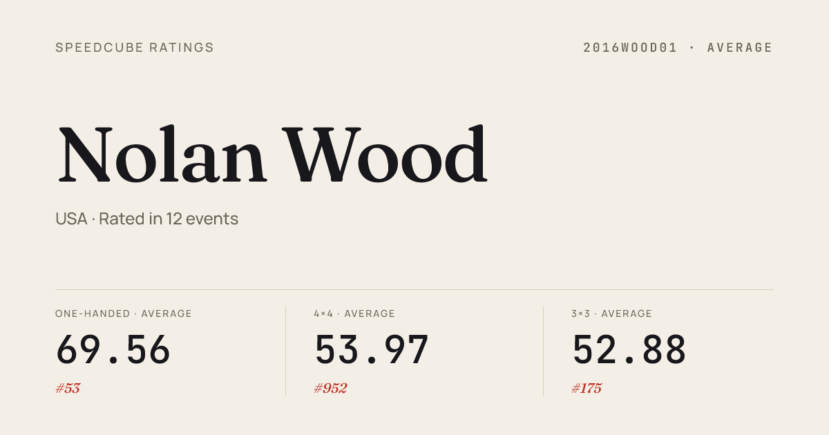 Apr 2, 20267x7x7 Cube · Round 1WestervilleWeeknight2026 · 5th3:22.46Mar 22, 20262x2x2 Cube · Round 1OhioStateMadness2026 · 3rd2.51Mar 22, 20262x2x2 Cube · Round 2OhioStateMadness2026 · 4th1.81Mar 22, 20262x2x2 Cube · FinalOhioStateMadness2026 · 3rd2.26Mar 22, 2026Pyraminx · Round 1OhioStateMadness2026 · 13th4.00Mar 22, 2026Pyraminx · FinalOhioStateMadness2026 · 17th5.82Mar 22, 2026Pyraminx · Round 2OhioStateMadness2026 · 9th2.92Mar 15, 20262x2x2 Cube · Round 2MorrowMixupMania2026 · 3rd2.29Mar 15, 20262x2x2 Cube · Round 1MorrowMixupMania2026 · 6th2.45Mar 15, 20262x2x2 Cube · FinalMorrowMixupMania2026 · 3rd1.83Mar 15, 20263x3x3 Cube · FinalMorrowMixupMania2026 · 2nd7.59Mar 15, 20263x3x3 Cube · Round 1MorrowMixupMania2026 · 2nd7.60Mar 15, 20263x3x3 Cube · Round 2MorrowMixupMania2026 · 2nd6.68Mar 15, 20263x3x3 One-Handed · FinalMorrowMixupMania2026 · 1st10.77Mar 15, 20263x3x3 One-Handed · Round 1MorrowMixupMania2026 · 2nd11.14Mar 15, 20264x4x4 Cube · Combined FinalMorrowMixupMania2026 · 3rd32.78Mar 15, 20265x5x5 Cube · Combined FinalMorrowMixupMania2026 · 5th1:09.82Mar 15, 2026Pyraminx · Round 1MorrowMixupMania2026 · 9th4.97Mar 15, 2026Pyraminx · FinalMorrowMixupMania2026 · 4th2.96Feb 21, 20262x2x2 Cube · Round 2CincinnatiSpeedsolving2026 · 3rd1.77
