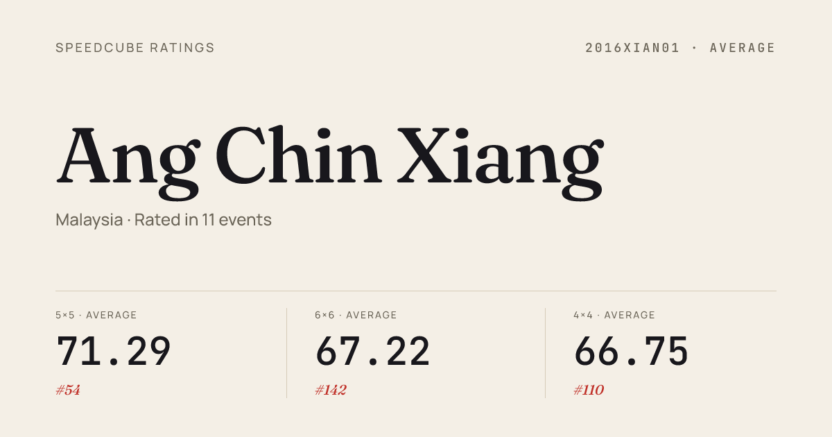 Apr 5, 20266x6x6 Cube · Round 1MYHMUoSMFinalCubeOpen2026 · 13th1:47.00Apr 5, 20267x7x7 Cube · Round 1MYHMUoSMFinalCubeOpen2026 · 7th2:31.19Apr 5, 20267x7x7 Cube · FinalMYHMUoSMFinalCubeOpen2026 · 6th2:25.45Apr 5, 2026Megaminx · FinalMYHMUoSMFinalCubeOpen2026 · 7th50.50Apr 5, 2026Megaminx · Round 1MYHMUoSMFinalCubeOpen2026 · 7th52.21Apr 5, 2026Skewb · Round 1MYHMUoSMFinalCubeOpen2026 · 2nd3.61Apr 5, 2026Skewb · FinalMYHMUoSMFinalCubeOpen2026 · 2nd3.54Apr 5, 2026Square-1 · FinalMYHMUoSMFinalCubeOpen2026 · 3rd8.96Apr 5, 2026Square-1 · Round 1MYHMUoSMFinalCubeOpen2026 · 6th12.26Nov 2, 20253x3x3 Cube · Semi-FinalMalaysiaCubeChampionship2025 · national · 17th9.16Nov 2, 20253x3x3 Cube · Round 2MalaysiaCubeChampionship2025 · national · 18th9.20Nov 2, 20253x3x3 Cube · Round 1MalaysiaCubeChampionship2025 · national · 17th9.09Nov 2, 20254x4x4 Cube · FinalMalaysiaCubeChampionship2025 · national · 4th29.60Nov 2, 20254x4x4 Cube · Round 1MalaysiaCubeChampionship2025 · national · 3rd29.36Nov 2, 20255x5x5 Cube · Round 1MalaysiaCubeChampionship2025 · national · 5th52.95Nov 2, 20255x5x5 Cube · FinalMalaysiaCubeChampionship2025 · national · 4th52.79Nov 2, 20256x6x6 Cube · Round 1MalaysiaCubeChampionship2025 · national · 3rd1:33.15Nov 2, 20256x6x6 Cube · FinalMalaysiaCubeChampionship2025 · national · 5th1:35.82Nov 2, 20257x7x7 Cube · FinalMalaysiaCubeChampionship2025 · national · 5th2:17.90