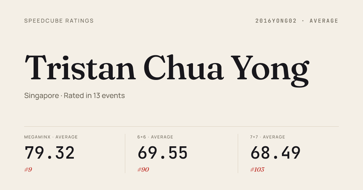 Apr 11, 20265x5x5 Cube · Round 1NUSMasters2026 · 3rd52.79Apr 11, 20265x5x5 Cube · FinalNUSMasters2026 · 2nd49.00Apr 11, 20266x6x6 Cube · FinalNUSMasters2026 · 2nd1:29.76Apr 11, 20266x6x6 Cube · Round 1NUSMasters2026 · 2nd1:30.71Apr 11, 20267x7x7 Cube · Round 1NUSMasters2026 · 3rd2:26.71Apr 11, 20267x7x7 Cube · FinalNUSMasters2026 · 2nd2:14.16Apr 11, 2026Clock · Round 1NUSMasters2026 · 15th9.60Apr 11, 2026Megaminx · FinalNUSMasters2026 · 1st31.00Apr 11, 2026Megaminx · Round 1NUSMasters2026 · 2nd35.38Apr 11, 2026Pyraminx · FinalNUSMasters2026 · 4th2.54Apr 11, 2026Pyraminx · Round 1NUSMasters2026 · 2nd2.73Apr 11, 2026Square-1 · Round 1NUSMasters2026 · 5th13.20Apr 11, 2026Square-1 · FinalNUSMasters2026 · 5th12.12Mar 29, 20263x3x3 Cube · FinalSingaporeSkewbyMarch2026 · 4th7.63Mar 29, 20263x3x3 Cube · Round 1SingaporeSkewbyMarch2026 · 11th9.05Mar 29, 20263x3x3 Cube · Round 2SingaporeSkewbyMarch2026 · 7th7.54Mar 29, 20265x5x5 Cube · FinalSingaporeSkewbyMarch2026 · 3rd48.32Mar 29, 20265x5x5 Cube · Round 2SingaporeSkewbyMarch2026 · 4th49.83Mar 29, 20265x5x5 Cube · Round 1SingaporeSkewbyMarch2026 · 5th53.90