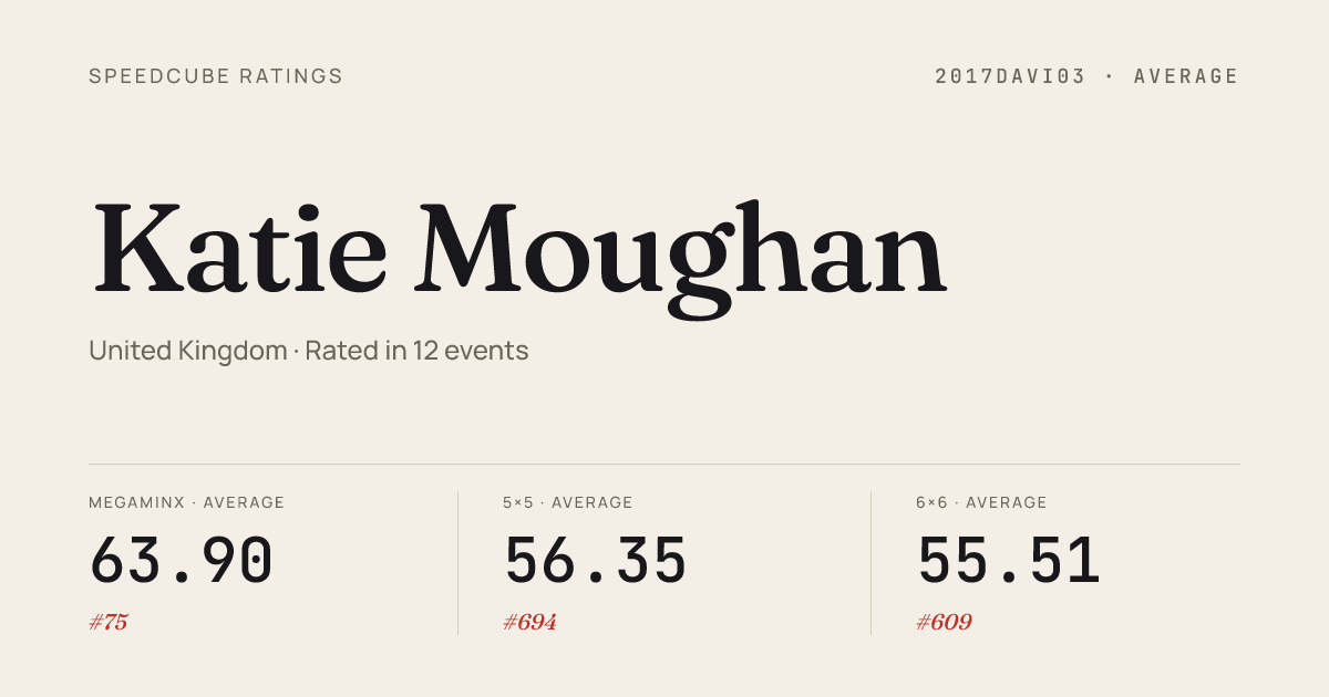 - Apr 19, 20263x3x3 Cube · Round 2LiverpoolSpring2026 · 7th8.93