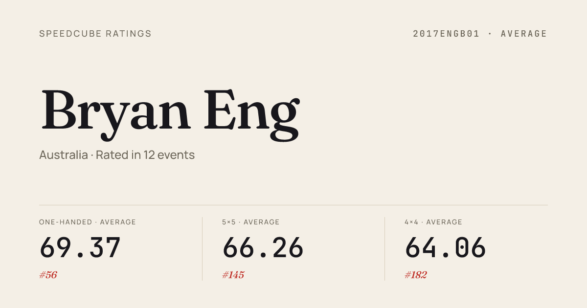 Apr 19, 2026Pyraminx · FinalNorthSydneyNoSeeing2026 · 6th3.72Mar 29, 20263x3x3 Cube · FinalNxNjoyableSydneyGathering2026 · 1st6.65Mar 29, 20263x3x3 Cube · Round 2NxNjoyableSydneyGathering2026 · 1st6.96Mar 29, 20263x3x3 Cube · Round 1NxNjoyableSydneyGathering2026 · 4th8.02Mar 29, 20264x4x4 Cube · FinalNxNjoyableSydneyGathering2026 · 1st27.11Mar 29, 20264x4x4 Cube · Round 1NxNjoyableSydneyGathering2026 · 1st29.46Mar 29, 20264x4x4 Cube · Round 2NxNjoyableSydneyGathering2026 · 3rd30.07Mar 29, 20265x5x5 Cube · Round 2NxNjoyableSydneyGathering2026 · 2nd50.16Mar 29, 20265x5x5 Cube · Round 1NxNjoyableSydneyGathering2026 · 2nd51.13Mar 29, 20265x5x5 Cube · FinalNxNjoyableSydneyGathering2026 · 3rd52.84Mar 29, 20266x6x6 Cube · Round 1NxNjoyableSydneyGathering2026 · 4th1:42.74Mar 29, 20266x6x6 Cube · Round 2NxNjoyableSydneyGathering2026 · 5th1:46.68Mar 29, 20266x6x6 Cube · FinalNxNjoyableSydneyGathering2026 · 3rd1:42.97Mar 29, 20267x7x7 Cube · FinalNxNjoyableSydneyGathering2026 · 2nd2:33.81Mar 29, 20267x7x7 Cube · Round 1NxNjoyableSydneyGathering2026 · 9th3:01.98Feb 1, 20262x2x2 Cube · FinalTramshedsVIIISummerSides2026 · 2nd1.77Feb 1, 20262x2x2 Cube · Round 1TramshedsVIIISummerSides2026 · 3rd2.01Feb 1, 20263x3x3 One-Handed · Round 1TramshedsVIIISummerSides2026 · 1st10.88Feb 1, 20263x3x3 One-Handed · FinalTramshedsVIIISummerSides2026 · 2nd11.62Feb 1, 2026Skewb · Round 1TramshedsVIIISummerSides2026 · 4th4.71