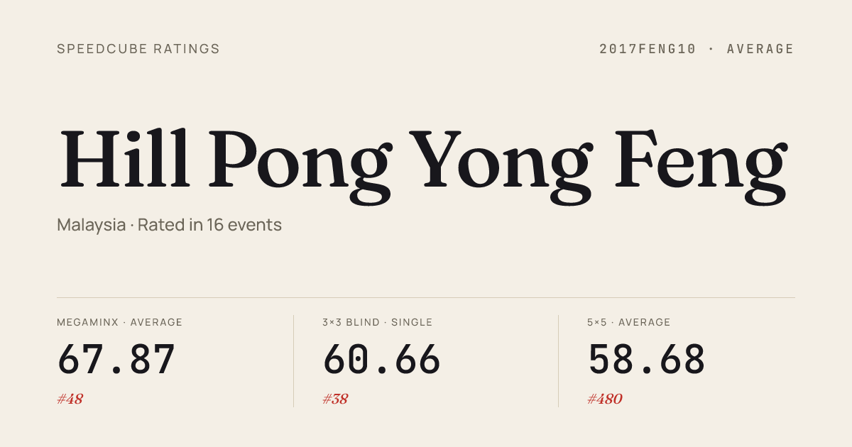 Mar 1, 20264x4x4 Cube · Round 1XMUMCubeOpen2026 · 19th33.85Mar 1, 20265x5x5 Cube · Round 1XMUMCubeOpen2026 · 21st1:02.27Mar 1, 20265x5x5 Cube · Round 2XMUMCubeOpen2026 · 10th56.89Mar 1, 2026Megaminx · Combined FinalXMUMCubeOpen2026 · 2nd36.58Nov 30, 20253x3x3 Blindfolded · FinalPBQKualaLumpur2025 · 1st21.92Nov 30, 20253x3x3 Multi-Blind · FinalPBQKualaLumpur2025 · 1st26/35 in 56:34Nov 30, 20254x4x4 Blindfolded · FinalPBQKualaLumpur2025 · 1st2:16.09Nov 30, 20255x5x5 Blindfolded · FinalPBQKualaLumpur2025 · 1st4:03.26Nov 16, 20252x2x2 Cube · Round 1PenangCubeMasters2025 · 19th4.01Nov 16, 20253x3x3 Cube · Round 1PenangCubeMasters2025 · 1st8.04Nov 16, 20253x3x3 Cube · Round 2PenangCubeMasters2025 · 2nd8.43Nov 16, 20253x3x3 Cube · FinalPenangCubeMasters2025 · 3rd8.00Nov 16, 20253x3x3 One-Handed · Combined FinalPenangCubeMasters2025 · 6th17.77Nov 16, 20254x4x4 Cube · Combined FinalPenangCubeMasters2025 · 5th34.59Nov 16, 20255x5x5 Cube · Combined FinalPenangCubeMasters2025 · 2nd55.36Nov 16, 20256x6x6 Cube · Combined FinalPenangCubeMasters2025 · 7th2:06.17Nov 16, 20257x7x7 Cube · Combined FinalPenangCubeMasters2025 · 6th3:32.09Nov 16, 2025Megaminx · Combined FinalPenangCubeMasters2025 · 1st35.39Nov 16, 2025Square-1 · Combined FinalPenangCubeMasters2025 · 6th21.86