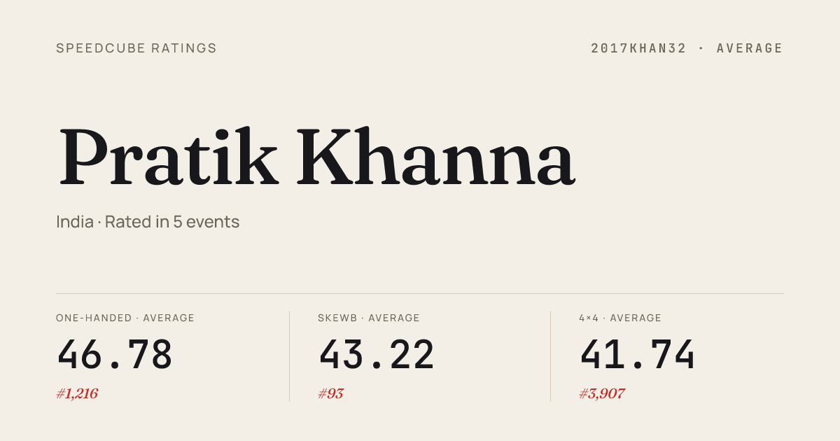 Nov 30, 20253x3x3 One-Handed · Round 1DelhiCubeChallenge2025 · 5th17.91Oct 26, 20252x2x2 Cube · Round 2SurgeSNUCubeOpen2025 · 22nd6.60Oct 26, 20252x2x2 Cube · Round 1SurgeSNUCubeOpen2025 · 18th5.22Oct 26, 20253x3x3 Cube · Round 2SurgeSNUCubeOpen2025 · 5th10.68Oct 26, 20253x3x3 Cube · FinalSurgeSNUCubeOpen2025 · 5th9.90Oct 26, 20253x3x3 Cube · Round 1SurgeSNUCubeOpen2025 · 5th9.82Oct 26, 2025Skewb · Round 2SurgeSNUCubeOpen2025 · 1st2.83Oct 26, 2025Skewb · Round 1SurgeSNUCubeOpen2025 · 2nd3.16Oct 26, 2025Skewb · FinalSurgeSNUCubeOpen2025 · 1st2.59Sep 14, 20252x2x2 Cube · Round 1BITSPilaniCubeOpen2025 · 16th6.12Sep 14, 20253x3x3 Cube · Round 1BITSPilaniCubeOpen2025 · 7th10.53Sep 14, 20253x3x3 Cube · FinalBITSPilaniCubeOpen2025 · 8th10.34Sep 14, 20253x3x3 One-Handed · Round 1BITSPilaniCubeOpen2025 · 3rd15.08Sep 14, 20253x3x3 One-Handed · FinalBITSPilaniCubeOpen2025 · 6th16.56Sep 14, 2025Skewb · Round 1BITSPilaniCubeOpen2025 · 1st2.65Sep 14, 2025Skewb · FinalBITSPilaniCubeOpen2025 · 1st3.28Aug 30, 20253x3x3 Cube · FinalSpeedcubingDelhiESYA2025 · 11th9.55Aug 30, 20253x3x3 Cube · Round 1SpeedcubingDelhiESYA2025 · 13th10.39Aug 30, 20253x3x3 Cube · Round 2SpeedcubingDelhiESYA2025 · 12th9.80