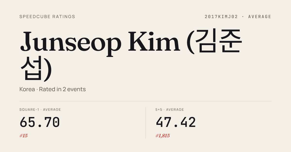Dec 28, 2025Square-1 · FinalKoreanChampionship2025 · national · 2nd6.42Dec 28, 2025Square-1 · Round 1KoreanChampionship2025 · national · 2nd7.94Jan 19, 20255x5x5 Cube · Round 1HappySuseong2025 · 23rd1:09.60Jan 19, 20255x5x5 Cube · Round 2HappySuseong2025 · 21st1:08.05Jan 19, 2025Square-1 · FinalHappySuseong2025 · 1st6.52Jan 19, 2025Square-1 · Round 1HappySuseong2025 · 2nd8.21Jan 19, 2025Square-1 · Round 2HappySuseong2025 · 1st6.94Mar 9, 2024Square-1 · FinalAnyangHaseyo2024 · 1st5.76Mar 9, 2024Square-1 · Round 1AnyangHaseyo2024 · 1st7.18