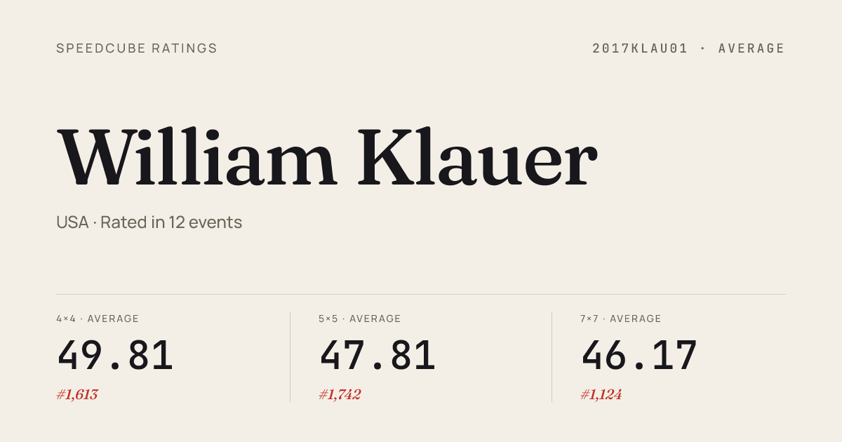 Sep 13, 20253x3x3 Blindfolded · FinalODUBigBlueOpen2025 · 8th4:15.84Sep 13, 20253x3x3 One-Handed · Combined FinalODUBigBlueOpen2025 · 8th17.56Sep 13, 20254x4x4 Cube · Combined FinalODUBigBlueOpen2025 · 6th38.04Sep 13, 2025Pyraminx · Round 1ODUBigBlueOpen2025 · 4th4.79Sep 13, 2025Pyraminx · FinalODUBigBlueOpen2025 · 3rd3.77Sep 6, 20253x3x3 Cube · Round 1FredericksburgSummerPM2025 · 4th9.49Sep 6, 20253x3x3 Cube · FinalFredericksburgSummerPM2025 · 4th9.51Sep 6, 20253x3x3 One-Handed · Combined FinalFredericksburgSummerPM2025 · 5th17.94Sep 6, 2025Pyraminx · FinalFredericksburgSummerPM2025 · 6th4.15Sep 6, 2025Pyraminx · Round 1FredericksburgSummerPM2025 · 12th6.48Aug 17, 20252x2x2 Cube · FinalVirginiaChampionship2025 · 27th3.81Aug 17, 20252x2x2 Cube · Round 2VirginiaChampionship2025 · 37th3.74Aug 17, 20252x2x2 Cube · Round 1VirginiaChampionship2025 · 43rd4.05Aug 17, 20253x3x3 Cube · Round 2VirginiaChampionship2025 · 25th9.61Aug 17, 20253x3x3 Cube · FinalVirginiaChampionship2025 · 36th11.19Aug 17, 20253x3x3 Cube · Round 1VirginiaChampionship2025 · 28th9.94Aug 17, 20253x3x3 One-Handed · Round 1VirginiaChampionship2025 · 12th15.45Aug 17, 20253x3x3 One-Handed · FinalVirginiaChampionship2025 · 17th17.52Aug 17, 20254x4x4 Cube · FinalVirginiaChampionship2025 · 13th34.75