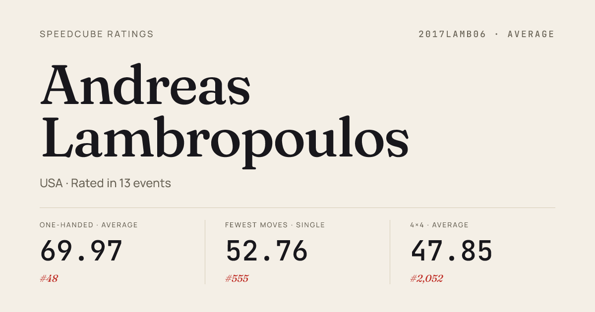 Mar 8, 20263x3x3 One-Handed · FinalNCSUWolfpackSpring2026 · 1st10.65Mar 8, 20264x4x4 Cube · Round 1NCSUWolfpackSpring2026 · 9th36.58Mar 8, 20264x4x4 Cube · FinalNCSUWolfpackSpring2026 · 15th40.63Mar 8, 2026Pyraminx · Round 1NCSUWolfpackSpring2026 · 36th8.25Mar 8, 2026Skewb · Round 1NCSUWolfpackSpring2026 · 10th5.49Feb 28, 20262x2x2 Cube · FinalNewMartinsvilleNewcomers2026 · 10th4.26Feb 28, 20262x2x2 Cube · Round 1NewMartinsvilleNewcomers2026 · 4th2.38Feb 28, 20263x3x3 Cube · FinalNewMartinsvilleNewcomers2026 · 6th9.21Feb 28, 20263x3x3 Cube · Round 2NewMartinsvilleNewcomers2026 · 7th9.18Feb 28, 20263x3x3 Cube · Round 1NewMartinsvilleNewcomers2026 · 6th9.32Feb 28, 20263x3x3 One-Handed · FinalNewMartinsvilleNewcomers2026 · 2nd10.74Feb 28, 20263x3x3 One-Handed · Round 1NewMartinsvilleNewcomers2026 · 1st10.21Feb 28, 20263x3x3 One-Handed · Round 2NewMartinsvilleNewcomers2026 · 2nd11.19Feb 28, 20264x4x4 Cube · FinalNewMartinsvilleNewcomers2026 · 8th39.40Feb 28, 20264x4x4 Cube · Round 1NewMartinsvilleNewcomers2026 · 7th38.65Feb 28, 2026Pyraminx · Round 1NewMartinsvilleNewcomers2026 · 15th6.75Feb 22, 20263x3x3 Cube · Round 1NxNNonsenseNC2026 · 3rd7.59Feb 22, 20263x3x3 Cube · FinalNxNNonsenseNC2026 · 1st7.60Feb 22, 20264x4x4 Cube · Round 1NxNNonsenseNC2026 · 17th37.85