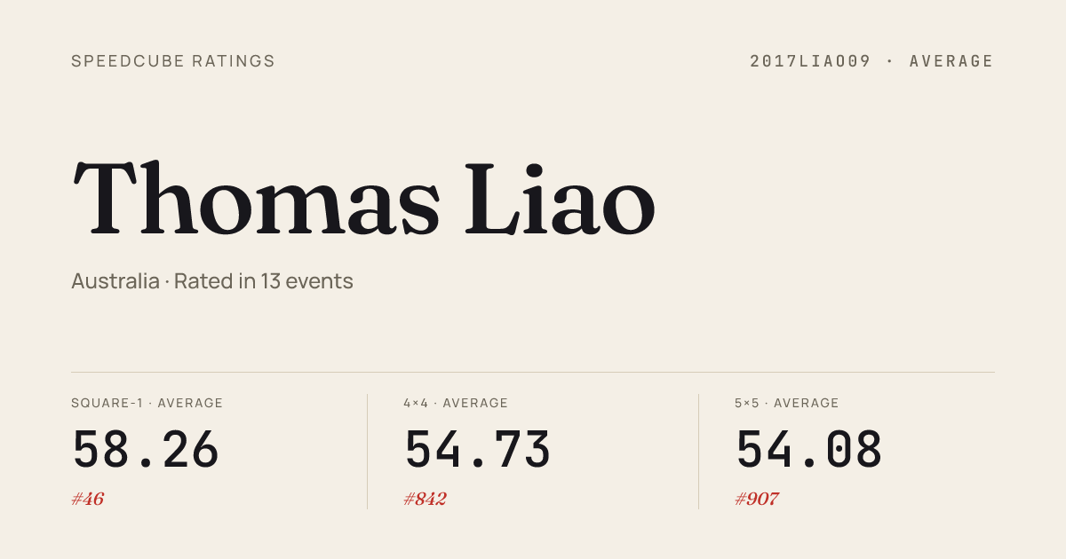 Feb 1, 2026Skewb · Round 1TramshedsVIIISummerSides2026 · 23rd7.43Feb 1, 2026Square-1 · Combined FinalTramshedsVIIISummerSides2026 · 1st7.90Jun 1, 20253x3x3 Blindfolded · Round 2NSWSideStateChampionship2025 · 13th2:51.90Jun 1, 20253x3x3 Blindfolded · Round 1NSWSideStateChampionship2025 · 15th3:23.47Jun 1, 20253x3x3 Fewest Moves · FinalNSWSideStateChampionship2025 · 9th39.67Jun 1, 20253x3x3 Multi-Blind · FinalNSWSideStateChampionship2025 · 7th3/3 in 20:23Jun 1, 20256x6x6 Cube · Round 1NSWSideStateChampionship2025 · 9th2:01.87Jun 1, 20257x7x7 Cube · Round 1NSWSideStateChampionship2025 · 9th3:13.66Jun 1, 2025Clock · Round 1NSWSideStateChampionship2025 · 20th11.39Jun 1, 2025Square-1 · FinalNSWSideStateChampionship2025 · 1st9.85Jun 1, 2025Square-1 · Round 1NSWSideStateChampionship2025 · 1st7.28Apr 27, 20252x2x2 Cube · Round 2NSWStateChampionship2025 · 20th3.18Apr 27, 20252x2x2 Cube · Round 1NSWStateChampionship2025 · 26th3.61Apr 27, 20253x3x3 Cube · Round 2NSWStateChampionship2025 · 11th8.90Apr 27, 20253x3x3 Cube · Round 1NSWStateChampionship2025 · 9th8.32Apr 27, 20253x3x3 Cube · FinalNSWStateChampionship2025 · 8th8.70Apr 27, 20253x3x3 One-Handed · Round 1NSWStateChampionship2025 · 3rd12.96Apr 27, 20253x3x3 One-Handed · FinalNSWStateChampionship2025 · 5th14.05Apr 27, 20254x4x4 Cube · Round 1NSWStateChampionship2025 · 6th31.85Apr 27, 20254x4x4 Cube · FinalNSWStateChampionship2025 · 4th30.23