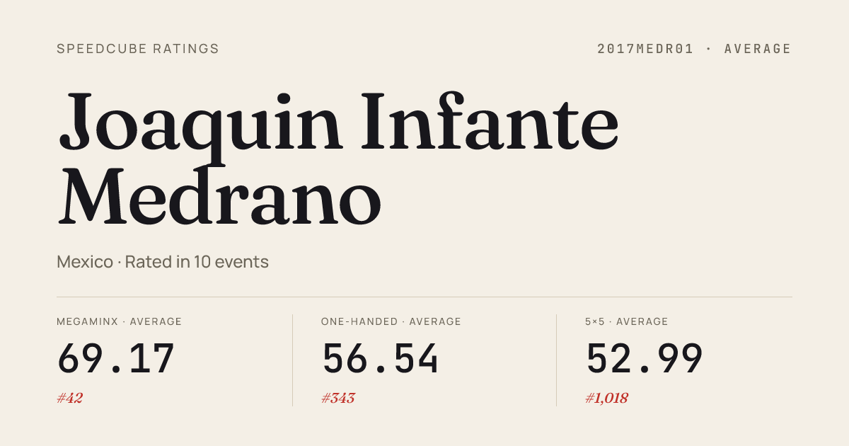 Apr 12, 2026Pyraminx · Round 2CaminosdeGTOLeon2026 · 12th8.25Dec 21, 20253x3x3 Cube · Round 2MexicanChampionship2025 · national · 2nd7.71Dec 21, 20253x3x3 Cube · Round 1MexicanChampionship2025 · national · 9th8.52Dec 21, 20253x3x3 Cube · Semi-FinalMexicanChampionship2025 · national · 17th8.96Dec 21, 20253x3x3 One-Handed · Round 1MexicanChampionship2025 · national · 6th14.28Dec 21, 20253x3x3 One-Handed · Round 2MexicanChampionship2025 · national · 5th13.32Dec 21, 20253x3x3 One-Handed · FinalMexicanChampionship2025 · national · 2nd12.78Dec 21, 20254x4x4 Cube · Round 1MexicanChampionship2025 · national · 38th38.69Dec 21, 20254x4x4 Cube · Round 2MexicanChampionship2025 · national · 48th40.72Dec 21, 20255x5x5 Cube · Round 2MexicanChampionship2025 · national · 32nd1:11.81Dec 21, 20255x5x5 Cube · Round 1MexicanChampionship2025 · national · 22nd1:04.97Dec 21, 20256x6x6 Cube · Round 1MexicanChampionship2025 · national · 31st2:21.44Dec 21, 2025Megaminx · Round 2MexicanChampionship2025 · national · 2nd35.54Dec 21, 2025Megaminx · FinalMexicanChampionship2025 · national · 1st35.25Dec 21, 2025Megaminx · Round 1MexicanChampionship2025 · national · 1st35.80Dec 21, 2025Pyraminx · Round 1MexicanChampionship2025 · national · 31st5.37Dec 21, 2025Pyraminx · Round 2MexicanChampionship2025 · national · 40th5.80Dec 21, 2025Skewb · Round 2MexicanChampionship2025 · national · 70th9.28Dec 21, 2025Skewb · Round 1MexicanChampionship2025 · national · 66th7.72