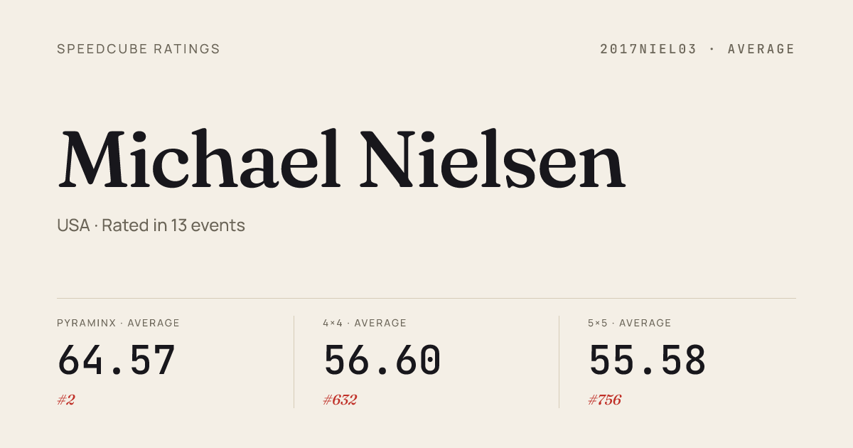 Feb 21, 20264x4x4 Cube · Combined FinalGobblerCubeDayWinter2026 · 2nd33.28Feb 21, 2026Clock · Combined FinalGobblerCubeDayWinter2026 · 13th8.66Feb 21, 2026Pyraminx · Round 1GobblerCubeDayWinter2026 · 1st2.03Feb 21, 2026Pyraminx · FinalGobblerCubeDayWinter2026 · 1st1.55Feb 21, 2026Skewb · FinalGobblerCubeDayWinter2026 · 2nd2.88Feb 21, 2026Skewb · Round 1GobblerCubeDayWinter2026 · 2nd3.38Nov 2, 20252x2x2 Cube · Round 1CubingUSAAllStars2025 · national · 10th1.63Nov 2, 20253x3x3 Cube · Round 2CubingUSAAllStars2025 · national · 10th7.10Nov 2, 20253x3x3 Cube · Round 1CubingUSAAllStars2025 · national · 11th6.69Nov 2, 2025Pyraminx · Round 1CubingUSAAllStars2025 · national · 2nd2.36Nov 2, 2025Pyraminx · FinalCubingUSAAllStars2025 · national · 1st1.65Nov 2, 2025Skewb · Round 1CubingUSAAllStars2025 · national · 13th4.47Sep 1, 20252x2x2 Cube · FinalMidAtlanticChampionship2025 · 8th1.88Sep 1, 20252x2x2 Cube · Round 2MidAtlanticChampionship2025 · 5th1.60Sep 1, 20252x2x2 Cube · Round 1MidAtlanticChampionship2025 · 8th2.00Sep 1, 20252x2x2 Cube · Semi-FinalMidAtlanticChampionship2025 · 7th1.58Sep 1, 20253x3x3 Cube · Round 2MidAtlanticChampionship2025 · 3rd6.81Sep 1, 20253x3x3 Cube · Round 1MidAtlanticChampionship2025 · 4th7.05Sep 1, 20253x3x3 Cube · Semi-FinalMidAtlanticChampionship2025 · 7th6.92