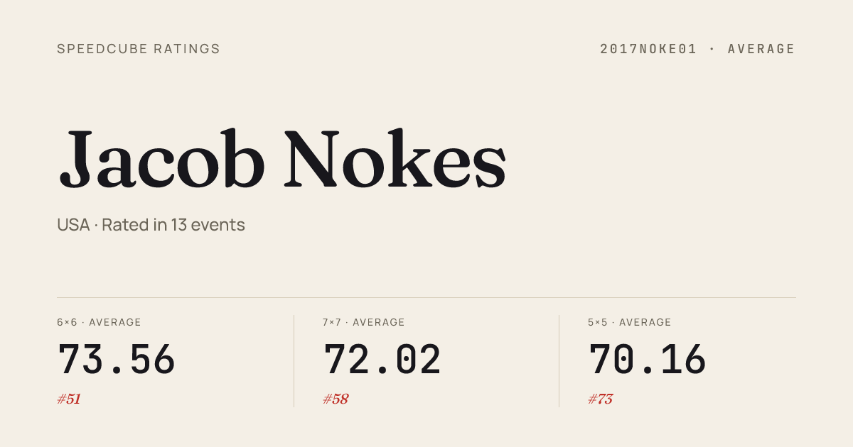 - Apr 11, 20263x3x3 Cube · Round 1ColoradoSpringsSpring2026 · 2nd8.01
