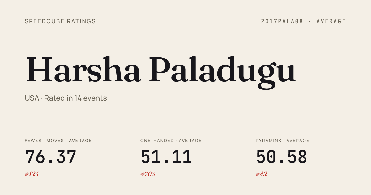 Mar 15, 20263x3x3 One-Handed · Round 1MorrowMixupMania2026 · 5th15.95Mar 15, 20263x3x3 One-Handed · FinalMorrowMixupMania2026 · 4th14.24Mar 15, 20264x4x4 Cube · Combined FinalMorrowMixupMania2026 · 14th45.40Mar 15, 2026Pyraminx · FinalMorrowMixupMania2026 · 1st1.68Mar 15, 2026Pyraminx · Round 1MorrowMixupMania2026 · 1st2.15Mar 14, 20263x3x3 Fewest Moves · FinalMorrowQuietMania2026 · 9th24Mar 7, 20262x2x2 Cube · Round 1OhioUniversity2026 · 25th5.06Mar 7, 20263x3x3 Cube · Round 2OhioUniversity2026 · 8th9.82Mar 7, 20263x3x3 Cube · FinalOhioUniversity2026 · 5th8.80Mar 7, 20263x3x3 Cube · Round 1OhioUniversity2026 · 10th9.92Mar 7, 20264x4x4 Cube · FinalOhioUniversity2026 · 12th45.82Mar 7, 20264x4x4 Cube · Round 1OhioUniversity2026 · 10th42.45Mar 7, 2026Clock · Round 1OhioUniversity2026 · 3rd6.02Mar 7, 2026Clock · FinalOhioUniversity2026 · 2nd5.45Mar 7, 2026Pyraminx · Round 1OhioUniversity2026 · 1st1.98Mar 7, 2026Pyraminx · FinalOhioUniversity2026 · 1st1.87Mar 7, 2026Skewb · Round 1OhioUniversity2026 · 9th5.91Mar 7, 2026Skewb · FinalOhioUniversity2026 · 10th6.28Feb 21, 20262x2x2 Cube · Round 1CincinnatiSpeedsolving2026 · 10th3.65