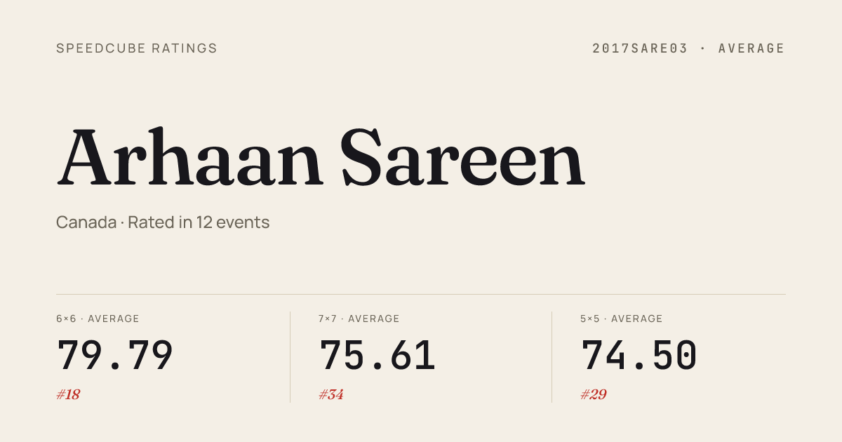 Jan 31, 20266x6x6 Cube · Combined FinalPickeringNxNxNWinter2026 · 2nd1:21.45Jan 31, 20267x7x7 Cube · Combined FinalPickeringNxNxNWinter2026 · 4th2:05.80Nov 29, 20253x3x3 Cube · Round 1WaterlooFall2025 · 3rd7.27Nov 29, 20253x3x3 Cube · FinalWaterlooFall2025 · 3rd7.18Nov 29, 20253x3x3 Cube · Round 2WaterlooFall2025 · 4th7.40Nov 29, 20253x3x3 One-Handed · FinalWaterlooFall2025 · 5th14.89Nov 29, 20253x3x3 One-Handed · Round 1WaterlooFall2025 · 5th15.43Nov 29, 20255x5x5 Cube · Combined FinalWaterlooFall2025 · 2nd47.89Nov 29, 2025Clock · Combined FinalWaterlooFall2025 · 5th7.78Nov 29, 2025Skewb · FinalWaterlooFall2025 · 4th4.40Nov 29, 2025Skewb · Round 1WaterlooFall2025 · 5th5.02Sep 13, 20252x2x2 Cube · FinalBrantfordFall2025 · 2nd2.09Sep 13, 20252x2x2 Cube · Round 1BrantfordFall2025 · 2nd1.96Sep 13, 20253x3x3 Cube · FinalBrantfordFall2025 · 2nd7.00Sep 13, 20253x3x3 Cube · Round 2BrantfordFall2025 · 2nd7.27Sep 13, 20253x3x3 Cube · Round 1BrantfordFall2025 · 2nd7.02Sep 13, 20254x4x4 Cube · Combined FinalBrantfordFall2025 · 2nd27.40Sep 13, 2025Pyraminx · FinalBrantfordFall2025 · 4th3.32Sep 13, 2025Pyraminx · Round 1BrantfordFall2025 · 4th3.82