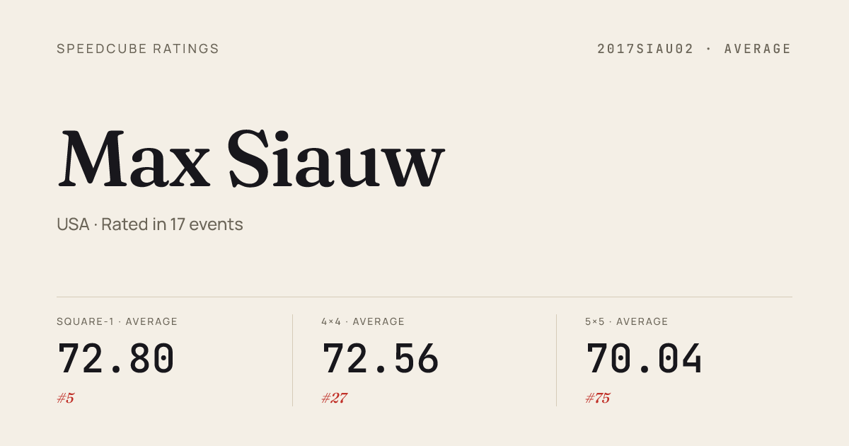 Dec 20, 2025Megaminx · Round 1PortlandinaPyraTree2025 · 2nd48.16Dec 20, 2025Megaminx · FinalPortlandinaPyraTree2025 · 4th51.35Dec 20, 2025Pyraminx · Round 1PortlandinaPyraTree2025 · 8th4.31Dec 20, 2025Square-1 · Round 1PortlandinaPyraTree2025 · 1st6.41Dec 20, 2025Square-1 · FinalPortlandinaPyraTree2025 · 2nd6.54Nov 22, 20253x3x3 Cube · Round 2KentFall2025 · 1st6.33Nov 22, 20253x3x3 Cube · Round 1KentFall2025 · 3rd7.04Nov 22, 20253x3x3 Cube · FinalKentFall2025 · 2nd6.39Nov 22, 2025Pyraminx · Round 1KentFall2025 · 8th4.23Nov 22, 2025Square-1 · Round 1KentFall2025 · 1st6.48Nov 22, 2025Square-1 · FinalKentFall2025 · 2nd5.81Nov 2, 20253x3x3 Cube · Round 2CubingUSAAllStars2025 · national · 6th6.37Nov 2, 20253x3x3 Cube · Round 1CubingUSAAllStars2025 · national · 8th6.37Nov 2, 20253x3x3 Cube · FinalCubingUSAAllStars2025 · national · 8th7.48Nov 2, 20254x4x4 Cube · FinalCubingUSAAllStars2025 · national · 4th24.94Nov 2, 20254x4x4 Cube · Round 1CubingUSAAllStars2025 · national · 4th25.30Nov 2, 20255x5x5 Cube · FinalCubingUSAAllStars2025 · national · 8th50.30Nov 2, 20255x5x5 Cube · Round 1CubingUSAAllStars2025 · national · 6th47.96Nov 2, 20256x6x6 Cube · FinalCubingUSAAllStars2025 · national · 8th1:35.39