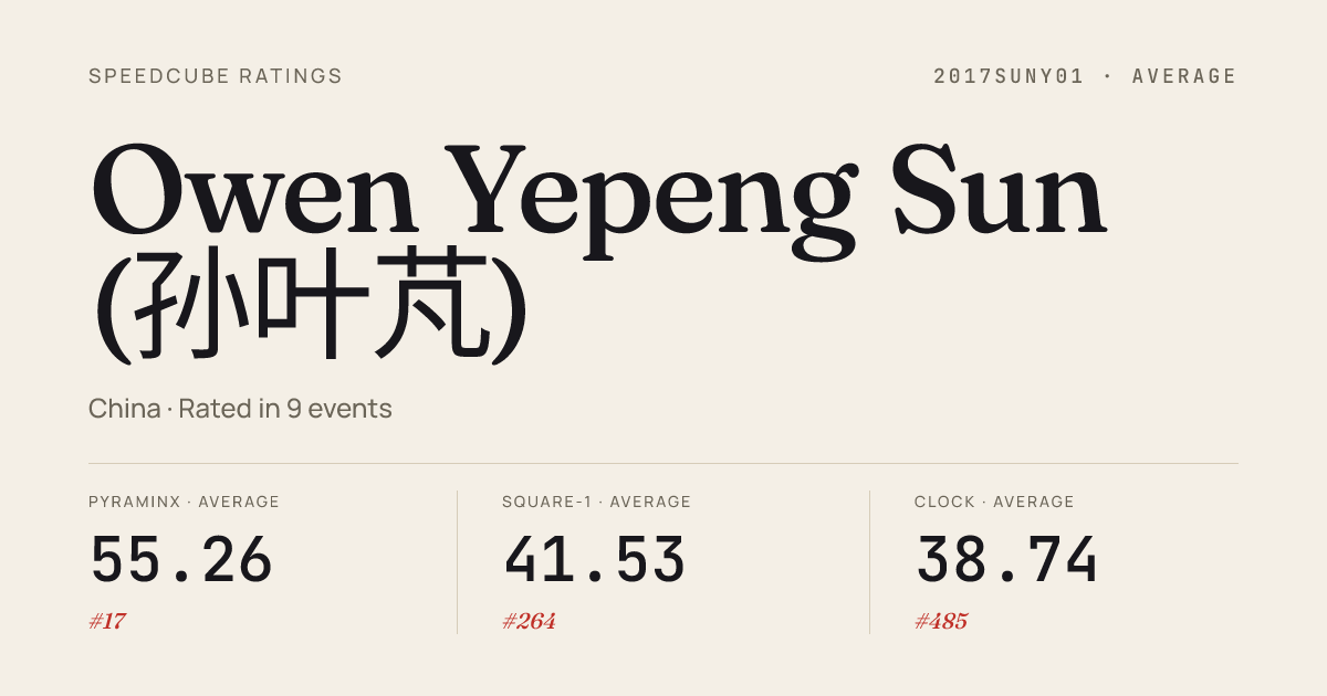 Mar 8, 2026Megaminx · Round 1XianjuSpecial2026 · 22nd1:20.77Mar 8, 2026Megaminx · FinalXianjuSpecial2026 · 19th1:12.49Mar 8, 2026Pyraminx · FinalXianjuSpecial2026 · 2nd1.80Mar 8, 2026Pyraminx · Round 2XianjuSpecial2026 · 3rd2.23Mar 8, 2026Pyraminx · Round 1XianjuSpecial2026 · 2nd2.39Mar 8, 2026Skewb · Round 2XianjuSpecial2026 · 16th5.75Mar 8, 2026Skewb · Round 1XianjuSpecial2026 · 13th5.40Mar 8, 2026Skewb · FinalXianjuSpecial2026 · 15th5.60Mar 8, 2026Square-1 · FinalXianjuSpecial2026 · 7th10.47Mar 8, 2026Square-1 · Round 1XianjuSpecial2026 · 7th10.95Jan 24, 20262x2x2 Cube · FinalAgouraWinter2026 · 16th5.59Jan 24, 20262x2x2 Cube · Round 1AgouraWinter2026 · 15th3.18Jan 24, 20263x3x3 Cube · Round 2AgouraWinter2026 · 33rd11.66Jan 24, 20263x3x3 Cube · Round 1AgouraWinter2026 · 26th10.90Jan 24, 2026Clock · Round 1AgouraWinter2026 · 5th5.20Jan 24, 2026Clock · Round 2AgouraWinter2026 · 10th6.47Jan 24, 2026Clock · FinalAgouraWinter2026 · 10th6.31Jan 24, 2026Square-1 · FinalAgouraWinter2026 · 5th11.19Jan 24, 2026Square-1 · Round 1AgouraWinter2026 · 8th12.83