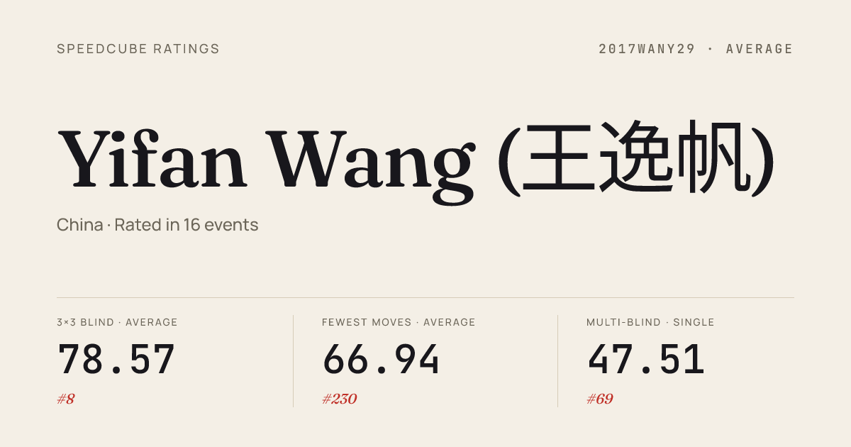 Apr 12, 20263x3x3 Blindfolded · Round 1XuzhouZenith2026 · 1st18.22Apr 12, 20263x3x3 Blindfolded · Round 2XuzhouZenith2026 · 1st15.88Mar 7, 20262x2x2 Cube · Round 2XianjuNxN2026 · 31st3.99Mar 7, 20262x2x2 Cube · Round 1XianjuNxN2026 · 33rd4.05Mar 7, 20263x3x3 Cube · Round 1XianjuNxN2026 · 57th10.73Mar 7, 20263x3x3 Cube · Round 2XianjuNxN2026 · 93rd14.53Mar 7, 20263x3x3 Blindfolded · FinalXianjuNxN2026 · 1st16.94Mar 7, 20263x3x3 Blindfolded · Round 1XianjuNxN2026 · 1st14.48Mar 7, 20263x3x3 One-Handed · Round 1XianjuNxN2026 · 36th22.63Mar 7, 20264x4x4 Cube · Round 1XianjuNxN2026 · 37th45.21Mar 7, 20265x5x5 Cube · Round 1XianjuNxN2026 · 26th1:20.99Feb 8, 20262x2x2 Cube · Round 1GuangdongRevivalRival2026 · 134th4.24Feb 8, 20263x3x3 Cube · Round 1GuangdongRevivalRival2026 · 228th11.35Feb 8, 20263x3x3 Cube · Round 2GuangdongRevivalRival2026 · 151st10.58Feb 8, 20263x3x3 Blindfolded · Round 1GuangdongRevivalRival2026 · 1st16.46Feb 8, 20263x3x3 Blindfolded · FinalGuangdongRevivalRival2026 · 3rd18.31Feb 8, 20263x3x3 Fewest Moves · FinalGuangdongRevivalRival2026 · 24th28Feb 8, 20263x3x3 Multi-Blind · FinalGuangdongRevivalRival2026 · 4th21/23 in 60:00Feb 8, 20264x4x4 Blindfolded · FinalGuangdongRevivalRival2026 · 11th3:25.35