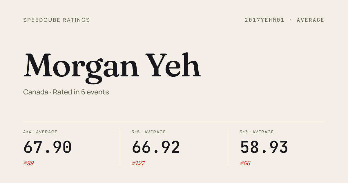 Mar 14, 20263x3x3 One-Handed · Combined FinalWesternOntarioWinter2026 · 4th14.87Mar 14, 20264x4x4 Cube · Combined FinalWesternOntarioWinter2026 · 2nd28.31Mar 14, 20265x5x5 Cube · Combined FinalWesternOntarioWinter2026 · 1st51.31Jan 31, 20263x3x3 Cube · Round 1PickeringNxNxNWinter2026 · 2nd6.15Jan 31, 20263x3x3 Cube · FinalPickeringNxNxNWinter2026 · 2nd6.57Jan 31, 20264x4x4 Cube · FinalPickeringNxNxNWinter2026 · 5th27.29Jan 31, 20264x4x4 Cube · Round 1PickeringNxNxNWinter2026 · 6th27.75Jan 31, 20265x5x5 Cube · Combined FinalPickeringNxNxNWinter2026 · 8th52.26Nov 29, 20253x3x3 Cube · Round 2WaterlooFall2025 · 1st6.39Nov 29, 20253x3x3 Cube · Round 1WaterlooFall2025 · 1st6.94Nov 29, 20253x3x3 Cube · FinalWaterlooFall2025 · 1st5.91Nov 29, 20253x3x3 One-Handed · Round 1WaterlooFall2025 · 12th17.87Nov 29, 20253x3x3 One-Handed · FinalWaterlooFall2025 · 6th16.15Nov 29, 20255x5x5 Cube · Combined FinalWaterlooFall2025 · 3rd49.95Nov 1, 20252x2x2 Cube · FinalPickeringFavouritesFall2025 · 7th2.97Nov 1, 20253x3x3 Cube · FinalPickeringFavouritesFall2025 · 2nd6.88Nov 1, 20253x3x3 Cube · Round 1PickeringFavouritesFall2025 · 1st6.29Nov 1, 20254x4x4 Cube · Combined FinalPickeringFavouritesFall2025 · 3rd25.51Nov 1, 20255x5x5 Cube · Combined FinalPickeringFavouritesFall2025 · 3rd51.51