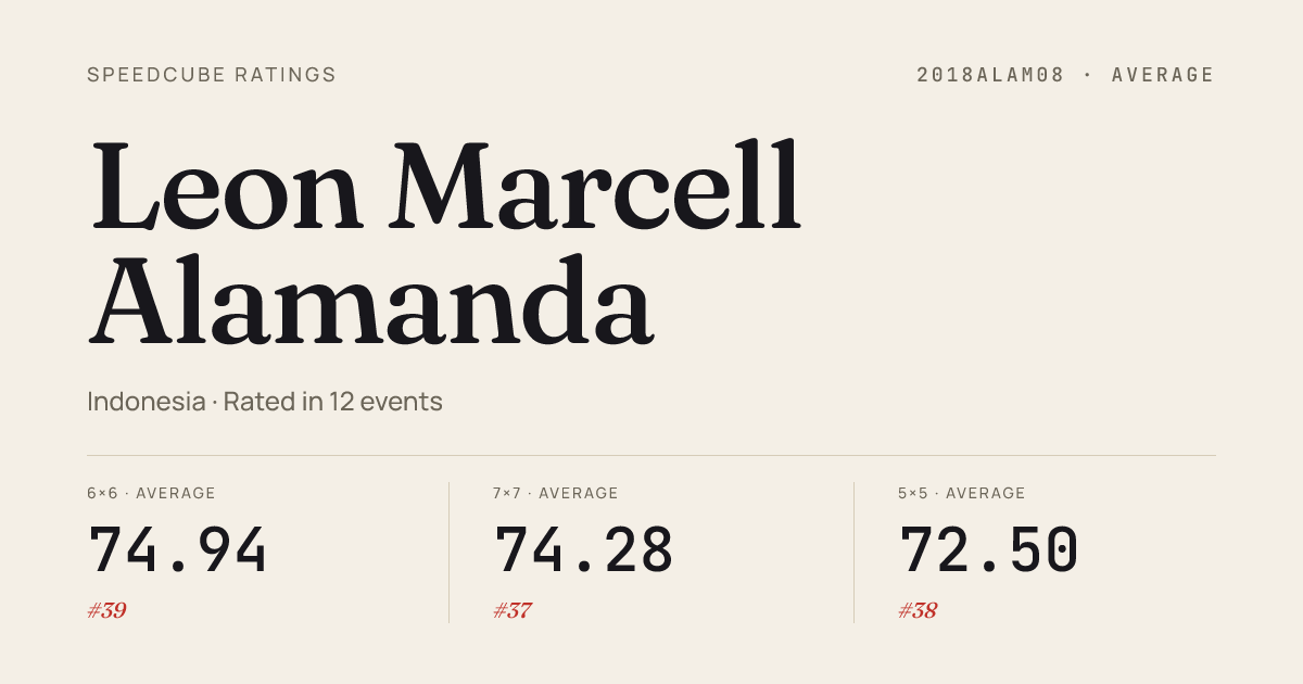 Feb 8, 20263x3x3 One-Handed · Combined FinalPISKGPremiereCubing2026 · 2nd11.94Feb 8, 20264x4x4 Cube · Round 1PISKGPremiereCubing2026 · 1st26.43Feb 8, 20264x4x4 Cube · FinalPISKGPremiereCubing2026 · 1st25.87Feb 8, 20265x5x5 Cube · Combined FinalPISKGPremiereCubing2026 · 1st48.60Feb 8, 2026Pyraminx · FinalPISKGPremiereCubing2026 · 4th4.33Feb 8, 2026Pyraminx · Round 1PISKGPremiereCubing2026 · 2nd4.27Jan 11, 20262x2x2 Cube · FinalJakartaNewYear2026 · 1st2.25Jan 11, 20262x2x2 Cube · Round 1JakartaNewYear2026 · 4th2.30Jan 11, 20263x3x3 Cube · Round 1JakartaNewYear2026 · 3rd7.57Jan 11, 20263x3x3 Cube · FinalJakartaNewYear2026 · 5th8.36Jan 11, 20263x3x3 Cube · Semi-FinalJakartaNewYear2026 · 1st7.28Jan 11, 20263x3x3 Cube · Round 2JakartaNewYear2026 · 1st7.07Jan 11, 20263x3x3 One-Handed · FinalJakartaNewYear2026 · 2nd12.09Jan 11, 20263x3x3 One-Handed · Round 1JakartaNewYear2026 · 2nd12.96Jan 11, 20264x4x4 Cube · Round 1JakartaNewYear2026 · 1st26.10Jan 11, 20264x4x4 Cube · FinalJakartaNewYear2026 · 1st28.80Jan 11, 20265x5x5 Cube · Round 1JakartaNewYear2026 · 1st46.24Jan 11, 20265x5x5 Cube · FinalJakartaNewYear2026 · 1st48.51Jan 11, 2026Clock · Combined FinalJakartaNewYear2026 · 3rd5.49