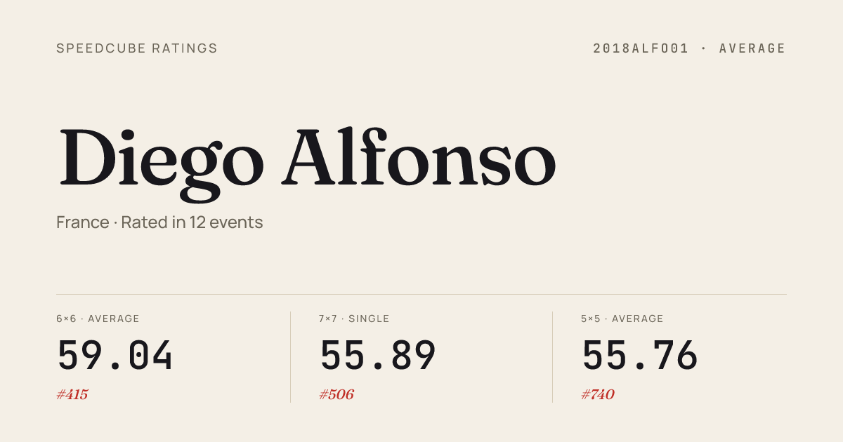 - Apr 6, 20263x3x3 Cube · Round 2FrenchChampionship2026 · national · 50th9.32