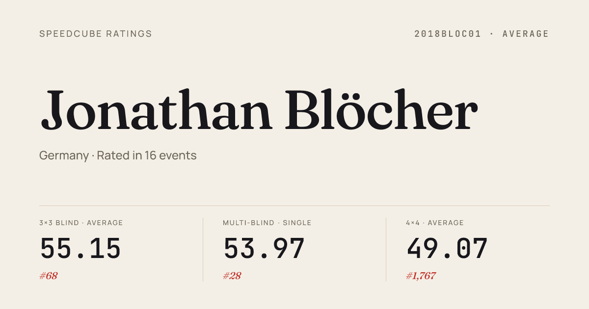 - Apr 12, 20263x3x3 Blindfolded · FinalBLDOpenFurth2026 · 4th19.92