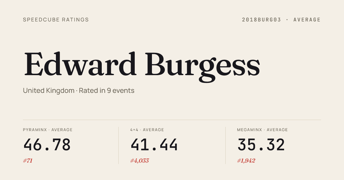 Mar 22, 2026Pyraminx · FinalCreweSpring2026 · 2nd2.05Mar 22, 2026Pyraminx · Round 1CreweSpring2026 · 2nd2.72Mar 22, 2026Square-1 · Combined FinalCreweSpring2026 · 30th49.23Jan 25, 20265x5x5 Cube · Round 1BattleforBelgrade2026 · 14th1:41.64Jan 25, 2026Megaminx · Combined FinalBattleforBelgrade2026 · 5th1:10.44Jan 25, 2026Pyraminx · Round 1BattleforBelgrade2026 · 2nd3.20Jan 25, 2026Pyraminx · FinalBattleforBelgrade2026 · 3rd3.45Jan 25, 2026Skewb · Round 1BattleforBelgrade2026 · 13th8.06Jan 25, 2026Square-1 · Combined FinalBattleforBelgrade2026 · 13th41.15Jan 17, 20264x4x4 Cube · Combined FinalManchesterFavouritesII2026 · 13th44.14Jan 17, 2026Megaminx · Combined FinalManchesterFavouritesII2026 · 9th1:07.52Jan 17, 2026Pyraminx · FinalManchesterFavouritesII2026 · 1st2.39Jan 17, 2026Skewb · FinalManchesterFavouritesII2026 · 6th6.67Dec 14, 20252x2x2 Cube · Round 1WiltshireWinter2025 · 11th3.12Dec 14, 20252x2x2 Cube · FinalWiltshireWinter2025 · 19th3.40Dec 14, 20253x3x3 Cube · Round 1WiltshireWinter2025 · 56th12.96Dec 14, 2025Megaminx · Round 1WiltshireWinter2025 · 34th1:12.43Dec 14, 2025Pyraminx · Round 1WiltshireWinter2025 · 1st1.84Dec 14, 2025Pyraminx · FinalWiltshireWinter2025 · 1st2.40