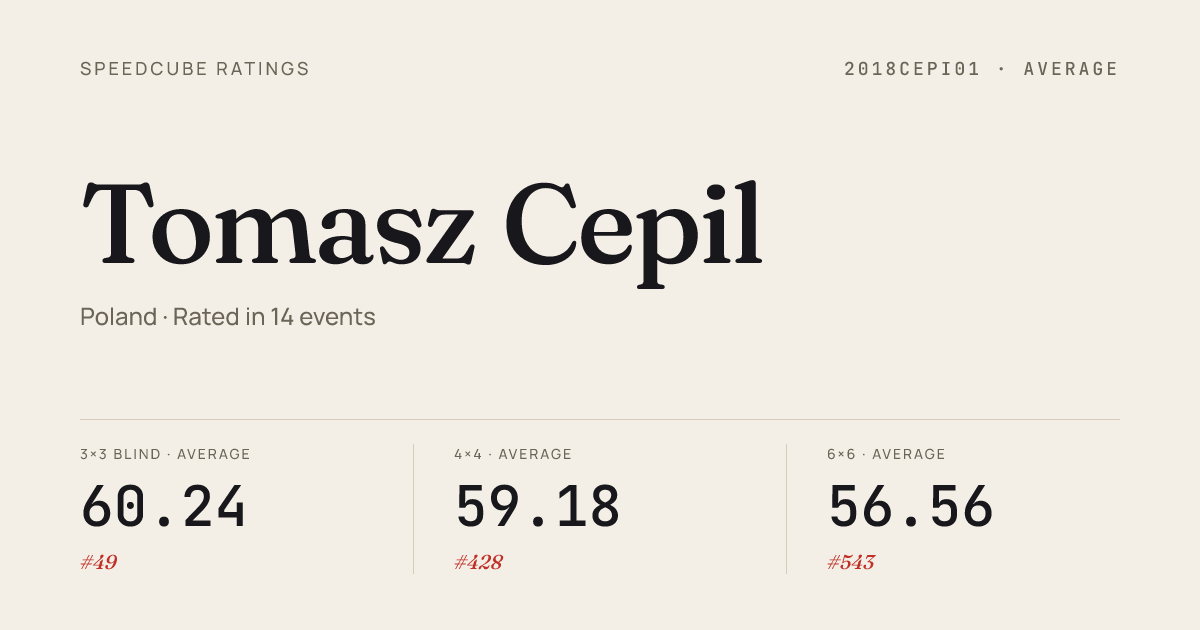 Mar 1, 20265x5x5 Blindfolded · FinalWIWatOpole2026 · 3rd16:28.00Mar 1, 20266x6x6 Cube · FinalWIWatOpole2026 · 3rd1:55.05Mar 1, 20267x7x7 Cube · FinalWIWatOpole2026 · 3rd3:14.29Mar 1, 2026Megaminx · Round 2WIWatOpole2026 · 3rd46.19Mar 1, 2026Megaminx · FinalWIWatOpole2026 · 4th44.91Mar 1, 2026Megaminx · Round 1WIWatOpole2026 · 4th47.47Mar 1, 2026Square-1 · Round 1WIWatOpole2026 · 6th22.26Mar 1, 2026Square-1 · FinalWIWatOpole2026 · 5th22.27Nov 16, 20252x2x2 Cube · Round 1PolishChampionship2025 · national · 114th4.02Nov 16, 20252x2x2 Cube · Round 2PolishChampionship2025 · national · 48th3.29Nov 16, 20253x3x3 Cube · Round 2PolishChampionship2025 · national · 15th7.59Nov 16, 20253x3x3 Cube · Round 1PolishChampionship2025 · national · 16th7.50Nov 16, 20253x3x3 Cube · Semi-FinalPolishChampionship2025 · national · 42nd8.65Nov 16, 20253x3x3 Blindfolded · Round 1PolishChampionship2025 · national · 6th23.40Nov 16, 20253x3x3 Multi-Blind · FinalPolishChampionship2025 · national · 8th24/27 in 57:08Nov 16, 20253x3x3 One-Handed · Round 1PolishChampionship2025 · national · 61st18.49Nov 16, 20254x4x4 Cube · FinalPolishChampionship2025 · national · 15th30.65Nov 16, 20254x4x4 Cube · Round 1PolishChampionship2025 · national · 16th31.09Nov 16, 20255x5x5 Cube · Round 1PolishChampionship2025 · national · 42nd1:05.89