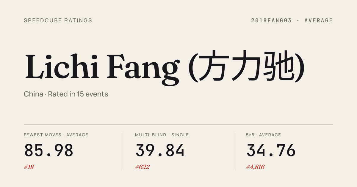 Aug 3, 20253x3x3 Blindfolded · Round 1Guangzhou3x3QuietDay2025 · 28th1:46.78Aug 3, 20253x3x3 Fewest Moves · FinalGuangzhou3x3QuietDay2025 · 1st22.00Jul 27, 20253x3x3 Fewest Moves · FinalFMCAsia2025 · 10th24.67Jul 6, 20253x3x3 Cube · Round 1WC2025 · world · 1281st12.82Jul 6, 20253x3x3 Fewest Moves · FinalWC2025 · world · 33rd21Jul 6, 20254x4x4 Cube · Round 1WC2025 · world · 959th46.87Jul 6, 2025Clock · Round 1WC2025 · world · 613th10.75Jul 6, 2025Pyraminx · Round 1WC2025 · world · 948th8.29Jul 6, 2025Skewb · Round 1WC2025 · world · 828th8.23Apr 19, 20253x3x3 One-Handed · Round 1DeqingSpring2025 · 52nd24.11Apr 19, 20254x4x4 Cube · Round 1DeqingSpring2025 · 75th51.02Apr 19, 20255x5x5 Cube · Combined FinalDeqingSpring2025 · 71st1:30.60Apr 19, 20256x6x6 Cube · Combined FinalDeqingSpring2025 · 65th3:32.83Apr 13, 20253x3x3 Blindfolded · Round 1PleaseBeQuietShanghai2025 · 23rd2:31.48Apr 13, 20253x3x3 Blindfolded · Round 2PleaseBeQuietShanghai2025 · 19th1:15.77Apr 13, 20253x3x3 Fewest Moves · Round 1PleaseBeQuietShanghai2025 · 2nd20.67Apr 13, 20253x3x3 Fewest Moves · FinalPleaseBeQuietShanghai2025 · 2nd21.33Apr 13, 20253x3x3 Multi-Blind · FinalPleaseBeQuietShanghai2025 · 14th7/11 in 56:05Mar 23, 20253x3x3 Fewest Moves · FinalDontDNFMarchSingapore2025 · 2nd22.33