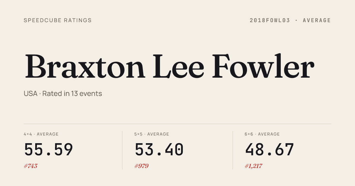 Mar 7, 20266x6x6 Cube · Round 1KCKC9BigandAwkward2026 · 9th2:12.47Mar 7, 20267x7x7 Cube · FinalKCKC9BigandAwkward2026 · 8th3:42.32Mar 7, 20267x7x7 Cube · Round 1KCKC9BigandAwkward2026 · 7th3:45.97Mar 7, 2026Megaminx · Round 2KCKC9BigandAwkward2026 · 12th1:09.02Mar 7, 2026Megaminx · Round 1KCKC9BigandAwkward2026 · 12th1:09.78Mar 7, 2026Megaminx · FinalKCKC9BigandAwkward2026 · 11th1:06.67Mar 7, 2026Square-1 · FinalKCKC9BigandAwkward2026 · 6th17.57Mar 7, 2026Square-1 · Round 1KCKC9BigandAwkward2026 · 6th18.32Jan 10, 20262x2x2 Cube · Round 1ConcordiaTurningWinter2026 · 1st1.92Jan 10, 20262x2x2 Cube · FinalConcordiaTurningWinter2026 · 1st1.66Jan 10, 20263x3x3 Cube · FinalConcordiaTurningWinter2026 · 7th9.62Jan 10, 20263x3x3 Cube · Round 1ConcordiaTurningWinter2026 · 6th10.22Jan 10, 20263x3x3 Cube · Round 2ConcordiaTurningWinter2026 · 11th10.20Jan 10, 20265x5x5 Cube · Round 1ConcordiaTurningWinter2026 · 3rd1:06.94Jan 10, 20265x5x5 Cube · FinalConcordiaTurningWinter2026 · 3rd1:02.24Jan 10, 2026Pyraminx · Round 1ConcordiaTurningWinter2026 · 5th4.42Jan 10, 2026Pyraminx · FinalConcordiaTurningWinter2026 · 11th5.81Jan 10, 2026Skewb · Round 1ConcordiaTurningWinter2026 · 16th6.91Jan 10, 2026Skewb · FinalConcordiaTurningWinter2026 · 16th9.38