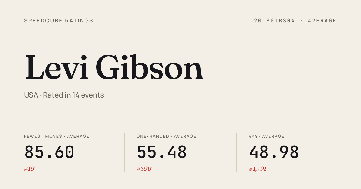 Apr 12, 20265x5x5 Cube · Round 1OberliNxN2026 · 9th1:13.07Mar 19, 20262x2x2 Cube · FinalOberlinWeeknightsI2026 · 2nd1.69Mar 19, 20262x2x2 Cube · Round 1OberlinWeeknightsI2026 · 4th2.54Mar 19, 20263x3x3 Cube · Round 1OberlinWeeknightsI2026 · 3rd8.89Mar 19, 20263x3x3 Cube · FinalOberlinWeeknightsI2026 · 4th9.27Mar 19, 20266x6x6 Cube · FinalOberlinWeeknightsI2026 · 4th2:38.99Feb 23, 20263x3x3 One-Handed · FinalBarbertonMini92026 · 3rd14.77Feb 23, 20263x3x3 One-Handed · Round 1BarbertonMini92026 · 2nd13.06Feb 23, 20265x5x5 Cube · FinalBarbertonMini92026 · 6th1:11.03Feb 23, 20265x5x5 Cube · Round 1BarbertonMini92026 · 6th1:08.06Feb 23, 2026Pyraminx · FinalBarbertonMini92026 · 5th3.66Feb 15, 20263x3x3 Fewest Moves · Round 1OberlinChallengeI2026 · 2nd23.67Feb 15, 20263x3x3 Fewest Moves · FinalOberlinChallengeI2026 · 1st22.67Jan 18, 20263x3x3 Fewest Moves · FinalNoSprintingNY2026 · 4th23.00Jan 18, 20263x3x3 One-Handed · Round 2NoSprintingNY2026 · 7th14.12Jan 18, 20263x3x3 One-Handed · Round 1NoSprintingNY2026 · 6th13.86Jan 18, 20263x3x3 One-Handed · FinalNoSprintingNY2026 · 5th12.93Jan 18, 20265x5x5 Cube · Round 1NoSprintingNY2026 · 13th1:15.51Jan 18, 20265x5x5 Cube · FinalNoSprintingNY2026 · 13th1:14.11