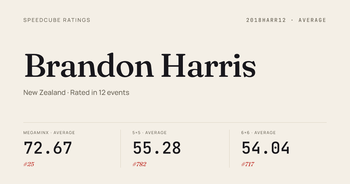 - Mar 1, 20263x3x3 Cube · Round 2NZNorthIslandChampionship2026 · 22nd10.46