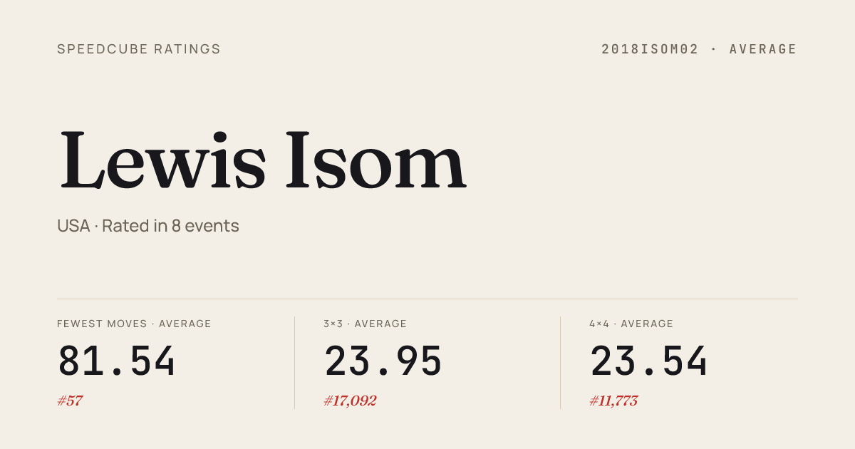 Jun 7, 20253x3x3 Cube · Round 1UtahSpeedcubingPride2025 · 32nd16.41Jun 7, 20253x3x3 Cube · Round 2UtahSpeedcubingPride2025 · 20th13.02Jun 7, 20253x3x3 Cube · FinalUtahSpeedcubingPride2025 · 20th14.07Jun 7, 2025Pyraminx · Round 1UtahSpeedcubingPride2025 · 27th10.82Jun 7, 2025Skewb · FinalUtahSpeedcubingPride2025 · 11th7.44Jun 7, 2025Skewb · Round 1UtahSpeedcubingPride2025 · 19th9.52May 25, 20253x3x3 Fewest Moves · FinalMaytheCubeBeSolvedCO2025 · 1st22.67May 17, 20253x3x3 Fewest Moves · FinalPBQtah82025 · 7th21May 14, 2025Clock · Combined FinalWolverineWeekdays2Orem2025 · 15th41.25May 14, 2025Megaminx · Combined FinalWolverineWeekdays2Orem2025 · 9th2:23.11Apr 5, 20253x3x3 Cube · Round 1UtahPfAIV2025 · 21st13.94Apr 5, 20253x3x3 Cube · FinalUtahPfAIV2025 · 19th12.56Apr 5, 2025Skewb · FinalUtahPfAIV2025 · 11th9.02Apr 5, 2025Skewb · Round 1UtahPfAIV2025 · 6th7.08Mar 22, 20252x2x2 Cube · Round 2UtahNewcomers2025 · 9th3.35Mar 22, 20252x2x2 Cube · FinalUtahNewcomers2025 · 14th4.67Mar 22, 20252x2x2 Cube · Round 1UtahNewcomers2025 · 7th2.85Mar 22, 20253x3x3 Cube · Round 1UtahNewcomers2025 · 34th13.94Mar 22, 20253x3x3 Cube · Round 2UtahNewcomers2025 · 40th14.76