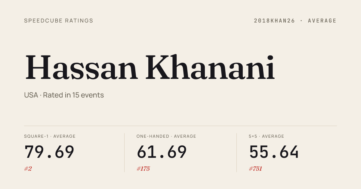 - Apr 19, 20263x3x3 Cube · Round 2HappyValleySpringPA2026 · 5th8.93