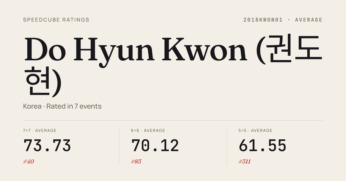 Oct 19, 20257x7x7 Cube · Round 1OkcheonAutumnBreeze2025 · 2nd2:09.57Oct 19, 20257x7x7 Cube · FinalOkcheonAutumnBreeze2025 · 2nd2:11.30Sep 14, 20256x6x6 Cube · Round 1WeLaughPohanghang2025 · 3rd1:30.64Sep 14, 20256x6x6 Cube · FinalWeLaughPohanghang2025 · 3rd1:32.51Sep 14, 2025Megaminx · FinalWeLaughPohanghang2025 · 4th42.29Sep 14, 2025Megaminx · Round 1WeLaughPohanghang2025 · 4th41.62Aug 17, 20255x5x5 Cube · Round 2KoreaOpen2025 · 6th55.03Aug 17, 20255x5x5 Cube · FinalKoreaOpen2025 · 7th55.27Aug 17, 20255x5x5 Cube · Round 1KoreaOpen2025 · 6th56.56Aug 17, 20256x6x6 Cube · FinalKoreaOpen2025 · 4th1:29.53Aug 17, 20256x6x6 Cube · Round 1KoreaOpen2025 · 3rd1:29.34Aug 17, 20257x7x7 Cube · FinalKoreaOpen2025 · 4th2:13.32Aug 17, 20257x7x7 Cube · Round 1KoreaOpen2025 · 3rd2:10.59Jun 29, 20253x3x3 Cube · Round 2OsanSummer2025 · 17th10.18Jun 29, 20253x3x3 Cube · Round 1OsanSummer2025 · 18th10.25Jun 29, 20253x3x3 Cube · FinalOsanSummer2025 · 13th10.07Jun 29, 20253x3x3 One-Handed · Round 1OsanSummer2025 · 30th24.23May 10, 20255x5x5 Cube · Round 1PleaseBigCubesKorea2025 · 8th56.83May 10, 20255x5x5 Cube · FinalPleaseBigCubesKorea2025 · 3rd50.19