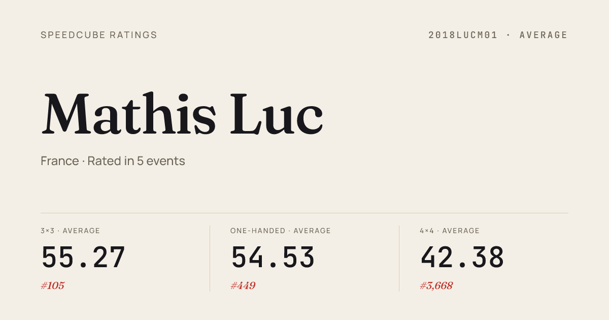 - Apr 6, 20263x3x3 Cube · Round 1FrenchChampionship2026 · national · 3rd6.65