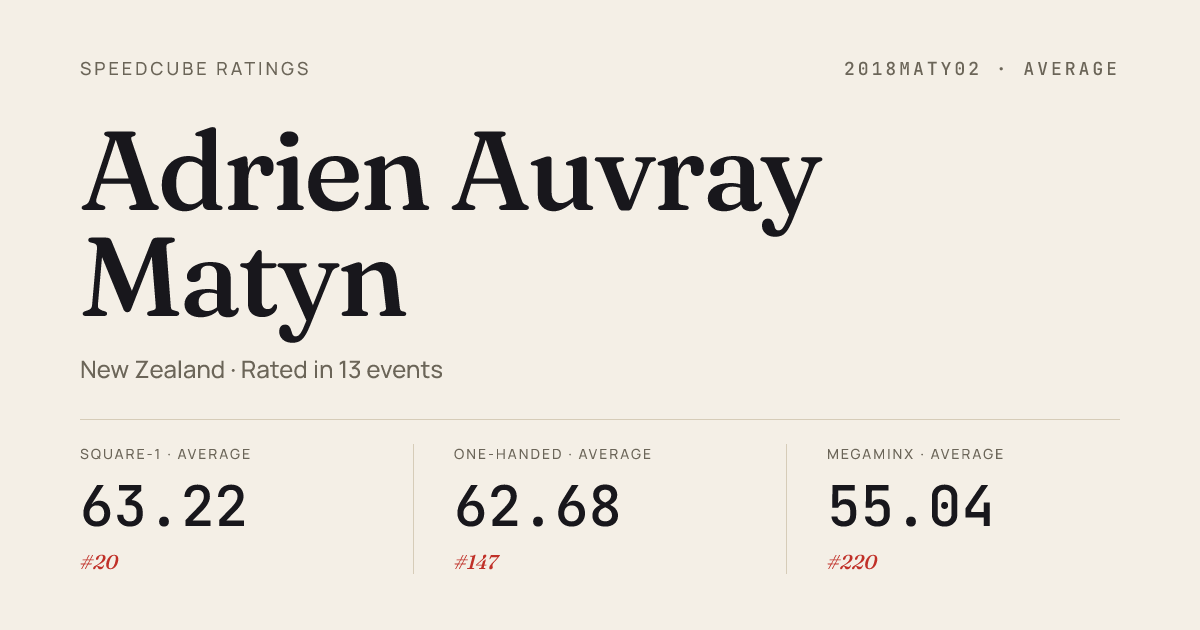 - Apr 12, 20263x3x3 Cube · FinalNZSouthIslandChamps2026 · 2nd5.42