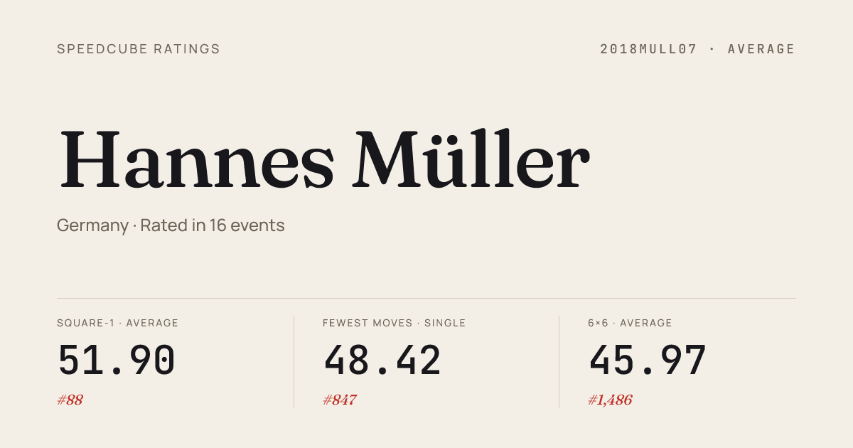 Apr 19, 20263x3x3 Blindfolded · FinalGermanOpen2026 · 6th1:35.33Apr 19, 20263x3x3 One-Handed · FinalGermanOpen2026 · 19th25.92Apr 19, 20263x3x3 One-Handed · Round 1GermanOpen2026 · 8th17.77Apr 19, 20264x4x4 Cube · Combined FinalGermanOpen2026 · 11th40.36Apr 19, 20264x4x4 Blindfolded · FinalGermanOpen2026 · 6th10:36.00Apr 19, 20265x5x5 Cube · Combined FinalGermanOpen2026 · 11th1:14.67Apr 19, 20266x6x6 Cube · Combined FinalGermanOpen2026 · 7th2:22.93Apr 19, 20267x7x7 Cube · Combined FinalGermanOpen2026 · 6th3:39.80Apr 19, 2026Clock · Round 1GermanOpen2026 · 8th8.13Apr 19, 2026Clock · FinalGermanOpen2026 · 13th13.20Apr 19, 2026Megaminx · Combined FinalGermanOpen2026 · 13th1:22.84Apr 19, 2026Pyraminx · FinalGermanOpen2026 · 5th4.31Apr 19, 2026Pyraminx · Round 1GermanOpen2026 · 6th4.84Apr 19, 2026Skewb · Round 1GermanOpen2026 · 18th7.74Apr 19, 2026Skewb · FinalGermanOpen2026 · 10th6.71Apr 19, 2026Square-1 · Round 1GermanOpen2026 · 1st9.51Apr 19, 2026Square-1 · FinalGermanOpen2026 · 1st8.37Mar 15, 20262x2x2 Cube · FinalBraunschweigOpen2026 · 22nd4.96Mar 15, 20262x2x2 Cube · Round 1BraunschweigOpen2026 · 23rd4.62