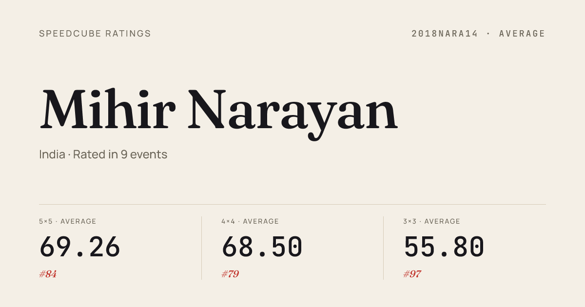 - Mar 21, 20263x3x3 Cube · Round 1MachesneyParkSpring2026 · 3rd6.94