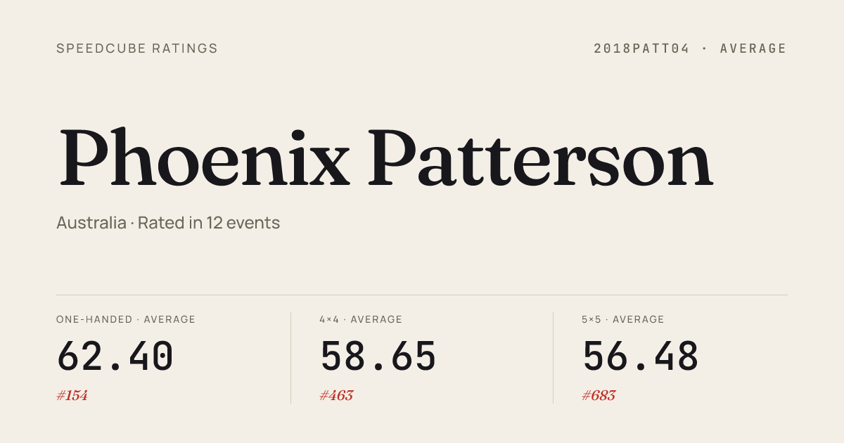 Apr 19, 20263x3x3 Cube · FinalSolvinginSale2026 · 4th6.99Apr 19, 20263x3x3 Fewest Moves · FinalSolvinginSale2026 · 4th33.67Apr 19, 20263x3x3 One-Handed · Combined FinalSolvinginSale2026 · 2nd11.20Apr 19, 20264x4x4 Cube · Combined FinalSolvinginSale2026 · 8th31.90Apr 19, 20265x5x5 Cube · Combined FinalSolvinginSale2026 · 9th1:00.05Apr 19, 2026Megaminx · Combined FinalSolvinginSale2026 · 7th47.83Apr 19, 2026Pyraminx · Round 1SolvinginSale2026 · 8th3.39Apr 19, 2026Pyraminx · Round 2SolvinginSale2026 · 3rd2.71Apr 19, 2026Pyraminx · FinalSolvinginSale2026 · 14th4.02Apr 19, 2026Skewb · Round 1SolvinginSale2026 · 9th4.90Apr 19, 2026Skewb · FinalSolvinginSale2026 · 8th4.31Apr 12, 20262x2x2 Cube · FinalWestMelbourneOpen2026 · 14th2.93Apr 12, 20262x2x2 Cube · Round 2WestMelbourneOpen2026 · 1st1.20Apr 12, 20262x2x2 Cube · Round 1WestMelbourneOpen2026 · 17th3.04Apr 12, 20263x3x3 Cube · Round 2WestMelbourneOpen2026 · 3rd7.43Apr 12, 20263x3x3 Cube · Semi-FinalWestMelbourneOpen2026 · 3rd6.99Apr 12, 20263x3x3 Cube · FinalWestMelbourneOpen2026 · 5th7.64Apr 12, 20263x3x3 Cube · Round 1WestMelbourneOpen2026 · 3rd7.15Apr 12, 20264x4x4 Cube · Round 1WestMelbourneOpen2026 · 5th29.68